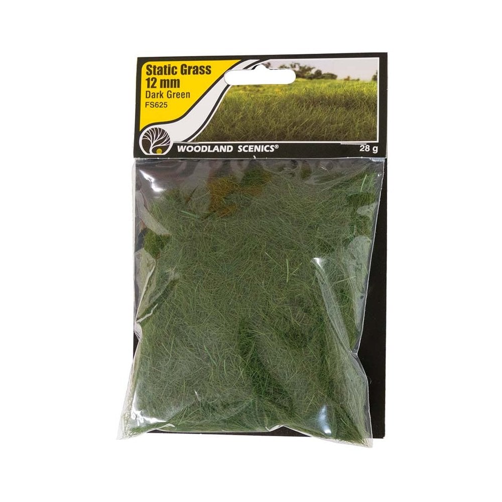 Woodland Scenics Static Grass Dark Green (12mm) is designed to replicate tall, lush vegetation in large-scale model scenes. The rich green colour offers realistic depth and coverage for creating wild, overgrown areas, thick grassland, or untouched embankments in scales such as O, G, or 1/35.