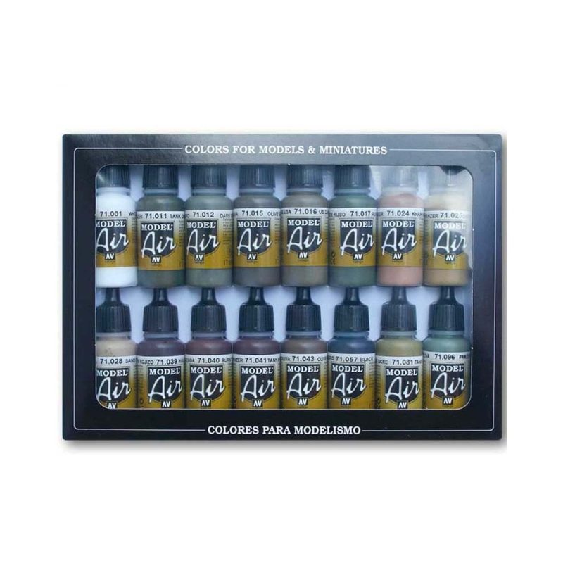 Set of 16 Model Air references for painting models, figures and dioramas. Contains 17 ml/0.57 fl oz (with eyedropper) bottles and a color chart.Content:71.001 White71.011 Dark Green RLM8371.012 Dark Green71.015 Dark Green RLM7171.016 USAF Olive Drab71.017 Russian Green 4BO71.024 Khaki Brown71.025 Dark Yellow71.028 Sand Yellow71.039 Hull Red71.040 Burnt Umber71.041 Armour Brown71.043 US Olive Drab71.057 Black71.081 Ochre71.096 Olive Grey