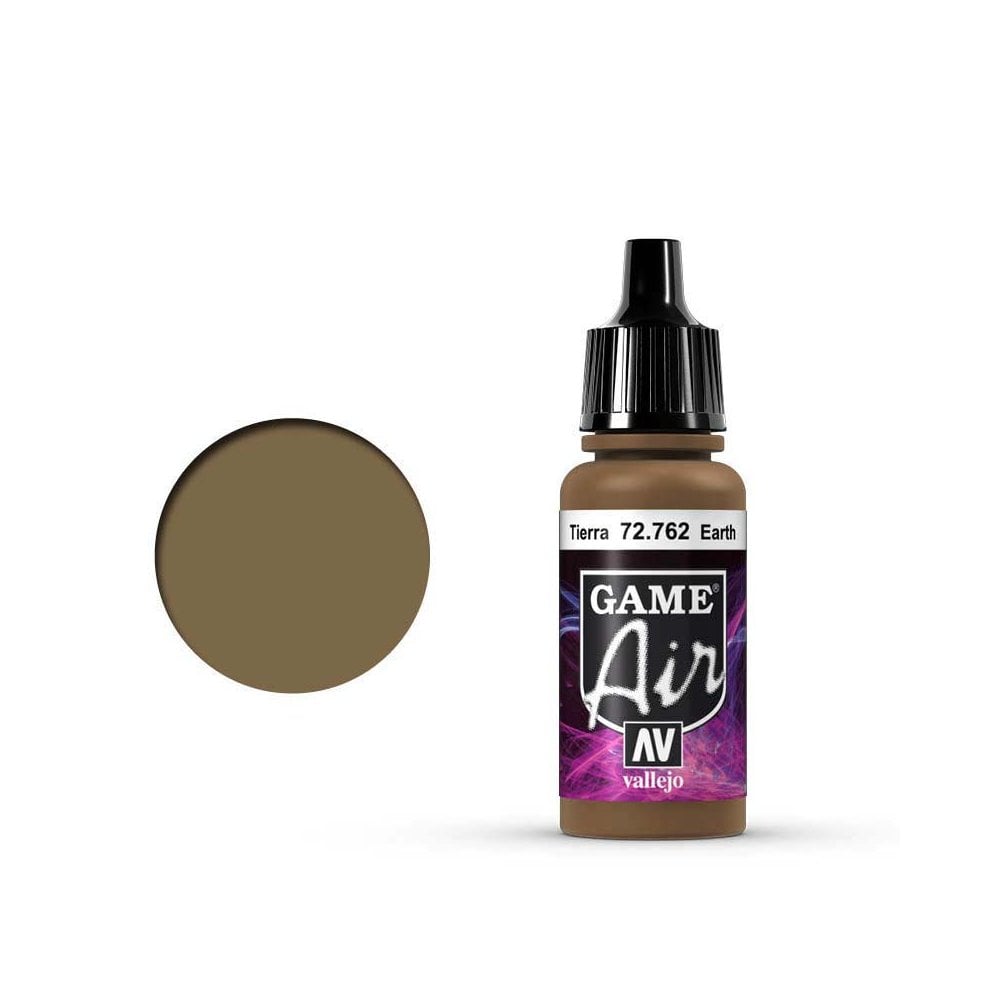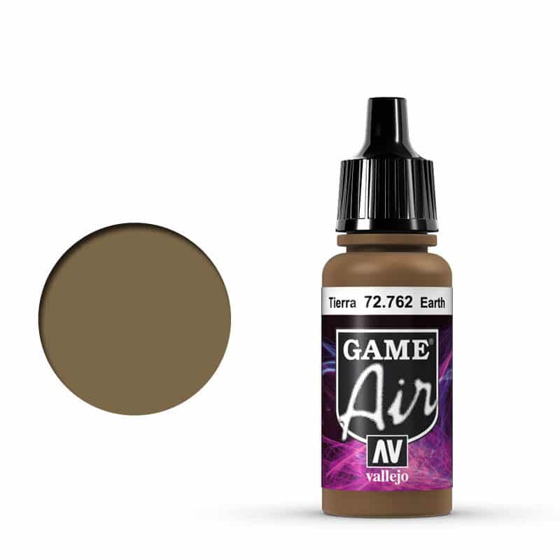 17ml Earth Vallejo Game Air 72.762 Game Air is a range of water-based, matte acrylic colors, developed especially for airbrushing. In the formulation of this range various new resins have been selected for qualities which up till now had not been achieved in water-based colors. The strength, resistance and covering power of Game Air is superior to any acrylic airbrush color currently available and also allows for application by brush to highlight the smallest details of the miniature. The pigments have been selected according to their degree of light-fastness and optimum micronization. The effects of washes and transparencies can be obtained by diluting the colors; all colors and varnishes can be mixed together and diluted with Airbrush Thinner.Game Air ColoursThe colors in the range have been selected in collaboration with modelers specialized in fantasy figures and dioramas, and the existing colors in the Game Color range have been taken into particular consideration. The names and shades of the most popular colors of Game Color have been maintained in Game Air, using the formulation and resins employed for Model Air (see Equivalency Table). In the color chart we include a diagram of the most frequent color combinations: base color, light and shadow.SurfacesGame Air has exceptional performance on all materials. The adhesion of the colors on resin, plastic, steel and white metal is extraordinary. Moreover the surfaces do not require previous priming. Only in the case of a very dark base may it be useful to first apply a primer in order to increase the brightness of the final colors.How to UseShake well before using. Pour the paint directly into the airbrush, either undiluted or previously diluted with Thinner (71.261). Colors can be mixed in the cup of the airbrush. Game Air dries almost instantly on the model and permits immediate application of aging processes as well as the use of washes, pigments, and dry-brush techniques.
