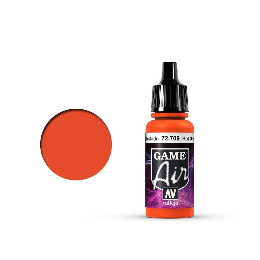 17ml Hot Orange Vallejo Game Air 72.709 Game Air is a range of water-based, matte acrylic colors, developed especially for airbrushing. In the formulation of this range various new resins have been selected for qualities which up till now had not been achieved in water-based colors. The strength, resistance and covering power of Game Air is superior to any acrylic airbrush color currently available and also allows for application by brush to highlight the smallest details of the miniature. The pigments have been selected according to their degree of light-fastness and optimum micronization. The effects of washes and transparencies can be obtained by diluting the colors; all colors and varnishes can be mixed together and diluted with Airbrush Thinner.Game Air ColoursThe colors in the range have been selected in collaboration with modelers specialized in fantasy figures and dioramas, and the existing colors in the Game Color range have been taken into particular consideration. The names and shades of the most popular colors of Game Color have been maintained in Game Air, using the formulation and resins employed for Model Air (see Equivalency Table). In the color chart we include a diagram of the most frequent color combinations: base color, light and shadow.SurfacesGame Air has exceptional performance on all materials. The adhesion of the colors on resin, plastic, steel and white metal is extraordinary. Moreover the surfaces do not require previous priming. Only in the case of a very dark base may it be useful to first apply a primer in order to increase the brightness of the final colors.How to UseShake well before using. Pour the paint directly into the airbrush, either undiluted or previously diluted with Thinner (71.261). Colors can be mixed in the cup of the airbrush. Game Air dries almost instantly on the model and permits immediate application of aging processes as well as the use of washes, pigments, and dry-brush techniques.