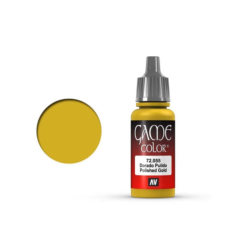 17ml Polished Gold Vallejo Game Color 72.055 Acrylics colors in a matt and opaque, water-based formula, especially designed for brush-on use. Each color has been meticulously developed in collaboration with model-painters who specialize in fantasy figures and dioramas.The formulation of these colors has been developed signed taking into account that some of these figures are used in tabletop games, so that Game Color is manufactured with a revolutionary new resin which offers extraordinary resistance to the damage caused by frequent handling. It is recommended to apply Game Color on a previously primed surface.The colors dry rapidly and form a homogenous and self-leveling film while preserving even the smallest detail of a miniature. Game Color presents an extra ordinary adherence on all grounds, such as resin, plastic, steel and white metal. Painting tools are cleaned with water.Game Color is not flammable, and does not contain solvents. Please see also certified safety information of the product on the Safety page.