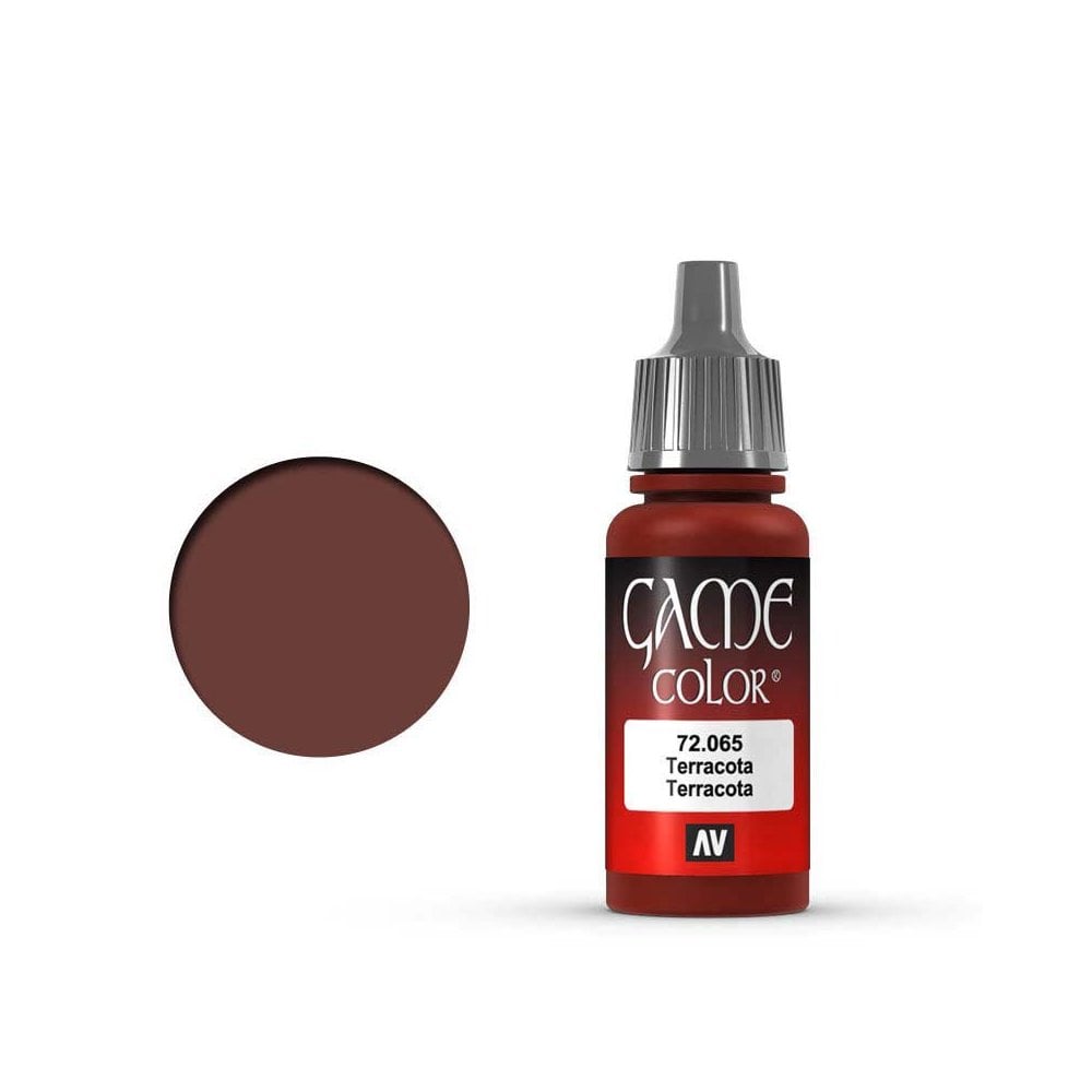 17ml Terracotta Vallejo Game Color 72.065 Acrylics colors in a matt and opaque, water-based formula, especially designed for brush-on use. Each color has been meticulously developed in collaboration with model-painters who specialize in fantasy figures and dioramas.The formulation of these colors has been developed signed taking into account that some of these figures are used in tabletop games, so that Game Color is manufactured with a revolutionary new resin which offers extraordinary resistance to the damage caused by frequent handling. It is recommended to apply Game Color on a previously primed surface.The colors dry rapidly and form a homogenous and self-leveling film while preserving even the smallest detail of a miniature. Game Color presents an extra ordinary adherence on all grounds, such as resin, plastic, steel and white metal. Painting tools are cleaned with water.Game Color is not flammable, and does not contain solvents. Please see also certified safety information of the product on the Safety page.