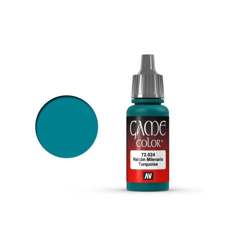 17ml Turquoise Vallejo Game Color 72.024 Acrylics colors in a matt and opaque, water-based formula, especially designed for brush-on use. Each color has been meticulously developed in collaboration with model-painters who specialize in fantasy figures and dioramas.The formulation of these colors has been developed signed taking into account that some of these figures are used in tabletop games, so that Game Color is manufactured with a revolutionary new resin which offers extraordinary resistance to the damage caused by frequent handling. It is recommended to apply Game Color on a previously primed surface.The colors dry rapidly and form a homogenous and self-leveling film while preserving even the smallest detail of a miniature. Game Color presents an extra ordinary adherence on all grounds, such as resin, plastic, steel and white metal. Painting tools are cleaned with water.Game Color is not flammable, and does not contain solvents. Please see also certified safety information of the product on the Safety page.