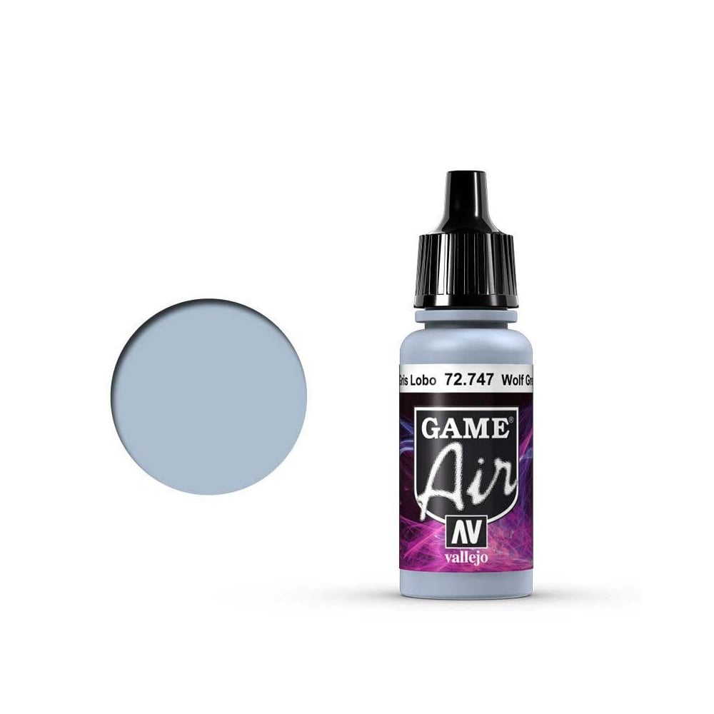 17ml Wolf Grey Vallejo Game Air 72.747 Game Air is a range of water-based, matte acrylic colors, developed especially for airbrushing. In the formulation of this range various new resins have been selected for qualities which up till now had not been achieved in water-based colors. The strength, resistance and covering power of Game Air is superior to any acrylic airbrush color currently available and also allows for application by brush to highlight the smallest details of the miniature. The pigments have been selected according to their degree of light-fastness and optimum micronization. The effects of washes and transparencies can be obtained by diluting the colors; all colors and varnishes can be mixed together and diluted with Airbrush Thinner.Game Air ColoursThe colors in the range have been selected in collaboration with modelers specialized in fantasy figures and dioramas, and the existing colors in the Game Color range have been taken into particular consideration. The names and shades of the most popular colors of Game Color have been maintained in Game Air, using the formulation and resins employed for Model Air (see Equivalency Table). In the color chart we include a diagram of the most frequent color combinations: base color, light and shadow.SurfacesGame Air has exceptional performance on all materials. The adhesion of the colors on resin, plastic, steel and white metal is extraordinary. Moreover the surfaces do not require previous priming. Only in the case of a very dark base may it be useful to first apply a primer in order to increase the brightness of the final colors.How to UseShake well before using. Pour the paint directly into the airbrush, either undiluted or previously diluted with Thinner (71.261). Colors can be mixed in the cup of the airbrush. Game Air dries almost instantly on the model and permits immediate application of aging processes as well as the use of washes, pigments, and dry-brush techniques.