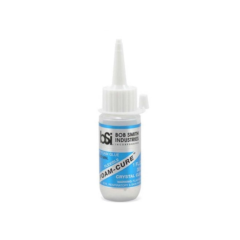 FOAM-CURE™ is a silicone based adhesive that works very well on EPP and EPO foams. It is crystal clear and cures to a more flexible consistency than CA. It is, however, not instant bonding like CA and there is no accelerator to speed it’s curing. To obtain a faster initial bond when bonding two pieces, FOAM-CURE™ can be applied to one piece and after the two are joined, they can then be pulled apart. After letting it air dry for about ten minutes, FOAM-CURE™ will act like a contact cement when the parts are rejoined, resulting in enough tack strength to allow the next steps of assembly. Full strength is reached in 10-12 hours. FOAM-CURE™ works with all foams, and will actually bond most other materials. It will bond wood and plastic to foam, and is a good canopy glue. FOAM-CURE™ does not, however, cure flexible enough to act as a hinge for aircraft control surfaces. Its limitations occur when bonding large areas of two non-porous materials. FOAM-CURE™ requires exposure to air for drying. If one tried to bond, for example, a half-dollar coin to glass, over 90% of the adhesive would never cure, since the solvent it contains would have no where to evaporate. A small amount of denatured alcohol can be mixed into the Foam-Cure to make it thinner.