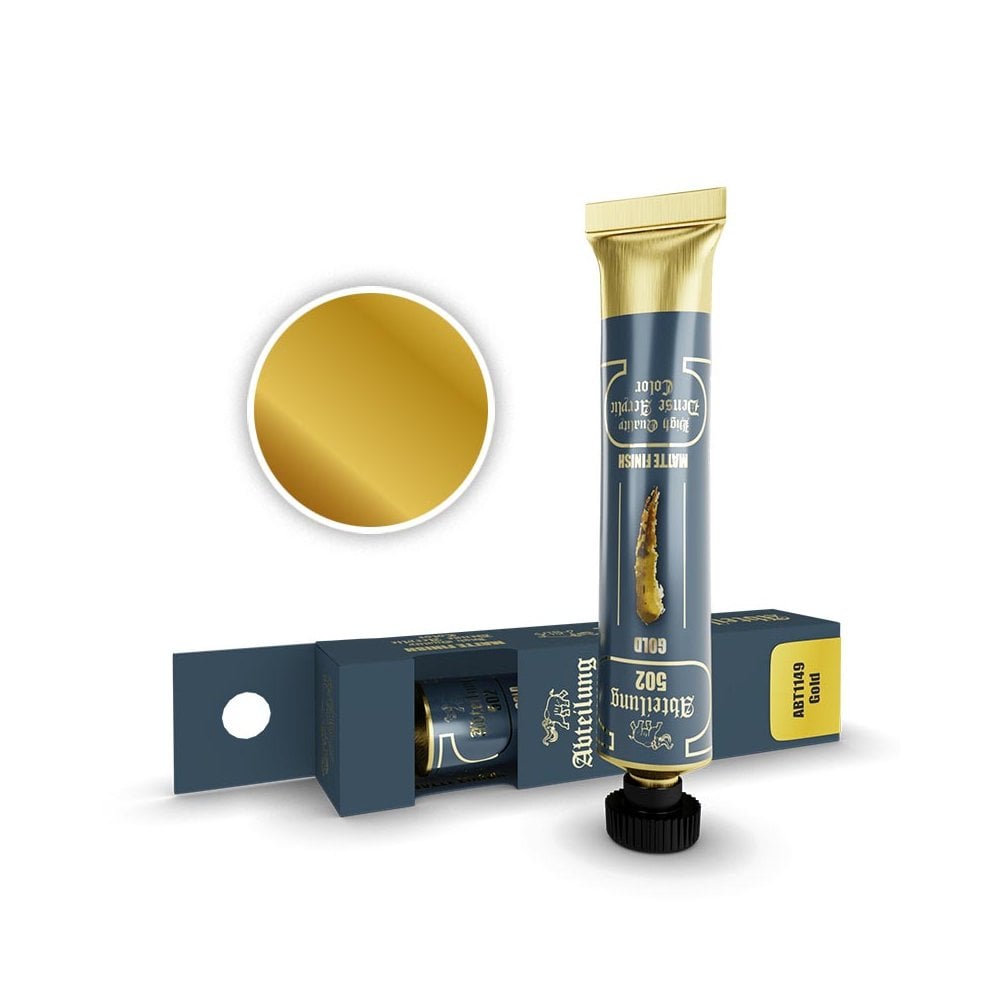 20ml Gold Acrylic TubeThe Abteilung 502 acrylic tube range for artists has a formula that offers maximum opacity and coverage, combined with the vividness and intensity of the color, and provides a matte finish.Specially designed for figure painters looking for the highest quality pigment finish,Abteilung 502 artist colors also have fine art applications such as painting on canvas or airbrushing or illustration, combining the short drying times with the smooth finish and endless possibilities of acrylics. The High Quality Dense Acrylics range from Abteilung 502 covers all the needs that artists and modelers may ever have. Their matte finish makes them perfect for figure painting and detailing, although they can be used in many ways