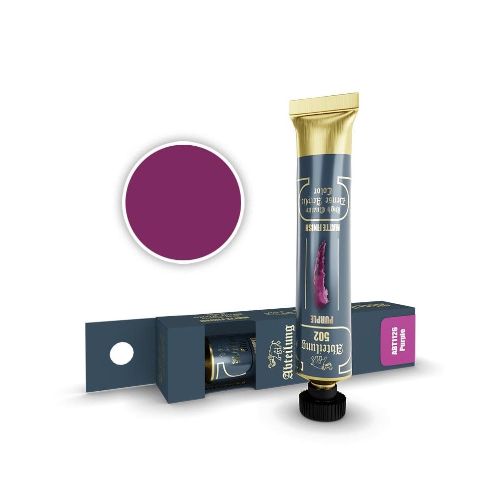 20ml Purple Acrylic TubeThe Abteilung 502 acrylic tube range for artists has a formula that offers maximum opacity and coverage, combined with the vividness and intensity of the color, and provides a matte finish.Specially designed for figure painters looking for the highest quality pigment finish,Abteilung 502 artist colors also have fine art applications such as painting on canvas or airbrushing or illustration, combining the short drying times with the smooth finish and endless possibilities of acrylics. The High Quality Dense Acrylics range from Abteilung 502 covers all the needs that artists and modelers may ever have. Their matte finish makes them perfect for figure painting and detailing, although they can be used in many ways