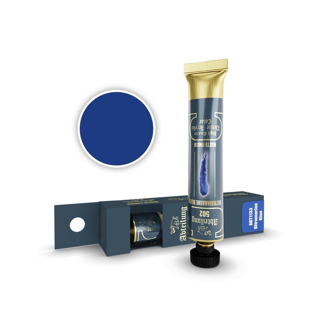 20ml Ultramarine Blue Acrylic TubeThe Abteilung 502 acrylic tube range for artists has a formula that offers maximum opacity and coverage, combined with the vividness and intensity of the color, and provides a matte finish.Specially designed for figure painters looking for the highest quality pigment finish,Abteilung 502 artist colors also have fine art applications such as painting on canvas or airbrushing or illustration, combining the short drying times with the smooth finish and endless possibilities of acrylics. The High Quality Dense Acrylics range from Abteilung 502 covers all the needs that artists and modelers may ever have. Their matte finish makes them perfect for figure painting and detailing, although they can be used in many ways