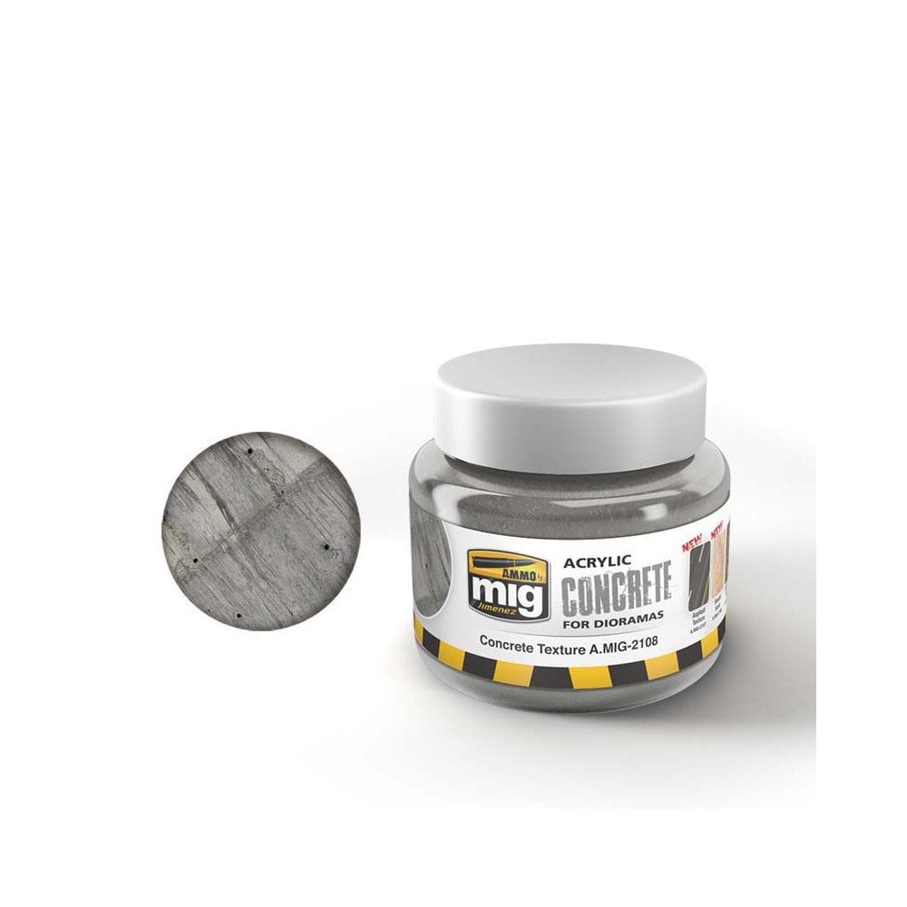 250ml Concrete Texture Ammo Mig Jimenez A.MIG-2108With a unique formula that provides extremely realistic results, AMMO has created the new CONCRETE TEXTURE effect to add the perfect finish to your small scenes and dioramas, practically indistinguishable from real concrete.