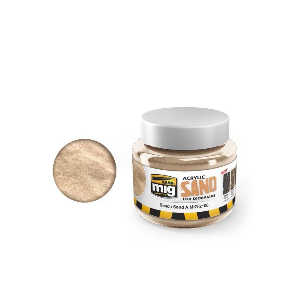 AMMO has created this new sand texture with a unique and distinct formula. It allows us to produce stunning finishes, almost lifelike in nature, for our dioramas, small scenes. The product is ready to use and has an acrylic base, which makes it easy to use. It can be applied to small and large scenery surfaces using very different styles of tools and can also be mixed with other materials like pigments to create amazingly realistic effects. Ideal texture for a range of scales from 1/16 to 1/72. If the effect is deemed to coarse, you can lightly sand the surface once the product has dried, easily creating the desired effect.Water soluble, odorless, and non-toxic.