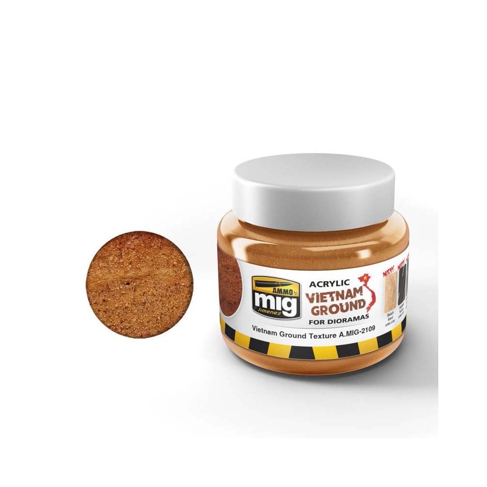 250ml Vietnam Ground Ammo A.MIG-2109The reddish orange mud and dust are the most iconic and recognizable features from images of the Vietnam War. That is why AMMO has created a unique new texture “Vietnam Ground” for acclimating vehicles to terrain, and create dioramas with complete accuracy. With a unique formula for creating extreme realism, the finish color and texture is identical to South East Asian soil.