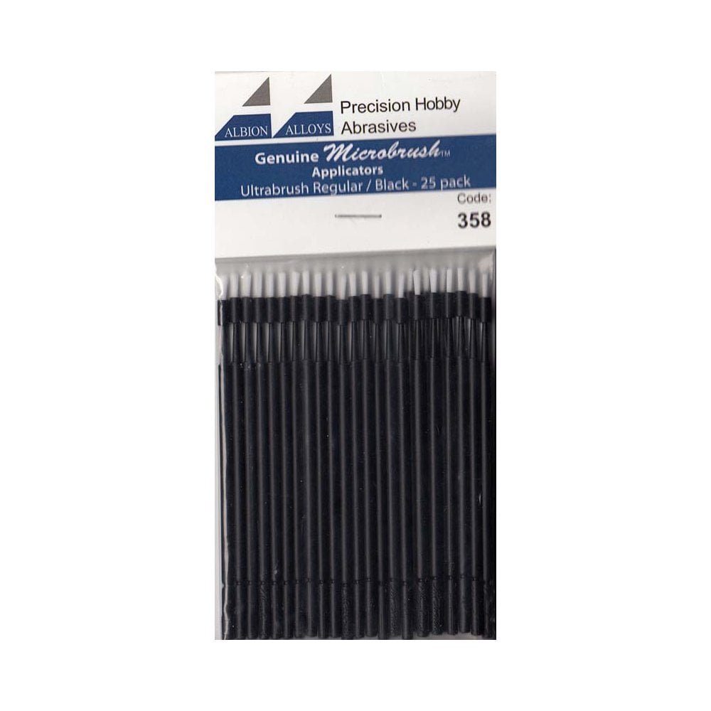The Albion Alloys 25pk Microbrush Black Regular (Product Code: 358) is an essential tool for precision application tasks in scale modelling, crafting, and other detailed work. These microbrushes are designed to deliver small, controlled amounts of liquids such as glue, paint, or decal solutions with accuracy and ease.