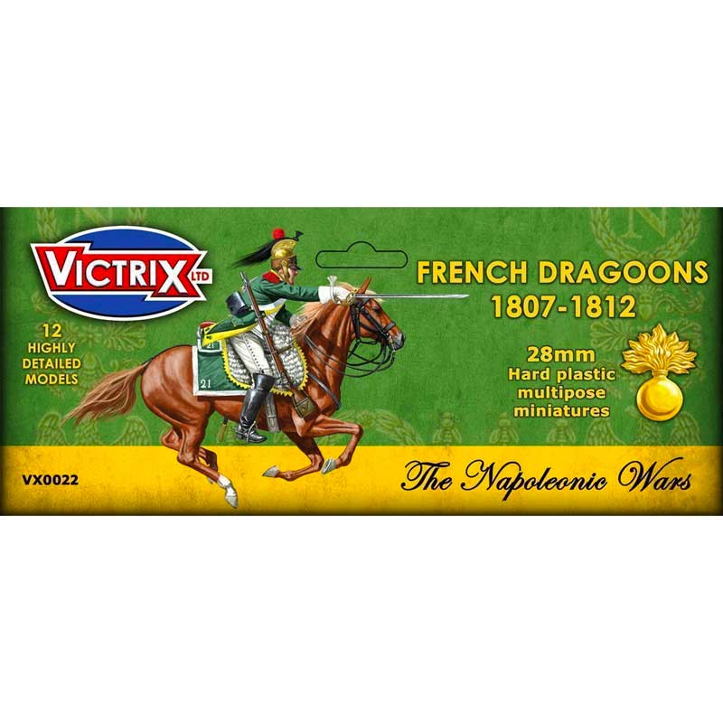 French Dragoons were among the most versatile cavalry in Napoleon’s Grande Armée. Originally designed to fight both mounted and dismounted, they evolved into a heavy cavalry force known for aggressive charges and battlefield mobility. Their distinctive green coats and Roman-style helmets gave them a striking appearance, and they featured prominently in campaigns from Spain to Russia. Though the 1812 Bardin regulations introduced uniform changes, many regiments retained their older long-tailed coats through 1813. Elite companies within each regiment were marked by fringed epaulettes and sometimes bearskins—features faithfully captured in this Victrix set, offering modellers a glimpse into one of Napoleon’s most iconic cavalry arms.