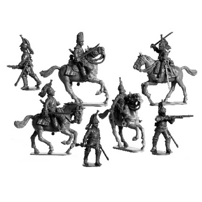 French dragoons played a vital dual-role as both mounted and dismounted troops, offering Napoleon flexible cavalry capable of engaging in a variety of battlefield tasks. Between 1812 and 1815, their role shifted more towards heavy cavalry, especially as cuirassiers became less available. Distinguished by their green uniforms, brass helmets with black horsehair crests, and long straight swords, dragoons were deployed in major campaigns across Europefrom the retreat from Moscow to the final stand at Waterloo. Their mobility and combat versatility made them invaluable in rear-guard actions, charges, and holding terrain. This set captures their unique transitional role and appearance during the dramatic final phase of the Napoleonic Wars.