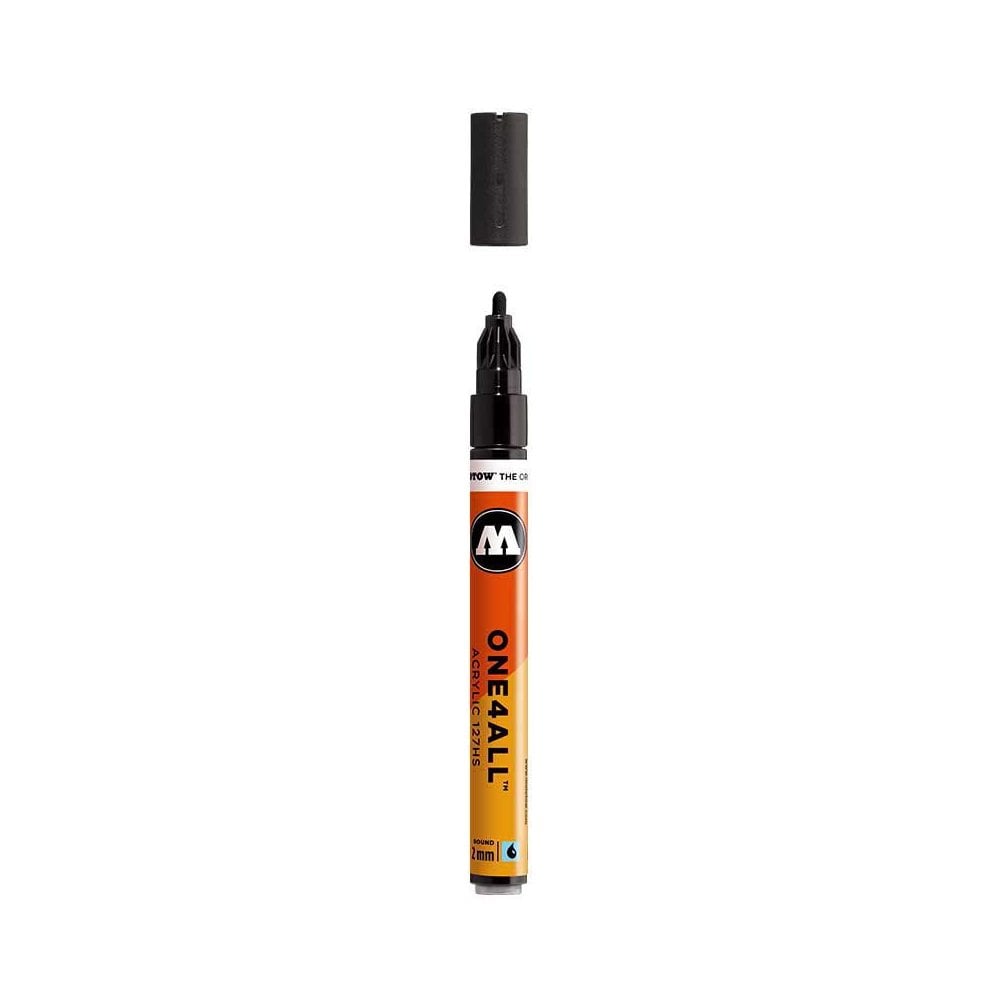 2mm 180 Signal Black Molotow 127212Highly opaque and UV resistant on nearly all surfaces: The sustainable ONE4ALL™ acrylic marker system has been built to refill and is always reliable in all its functions. A low wear and numerous possible applications offer an added value to these markers. Whether painting surf board, canvas, fridge, graffiti or sneakers: nothing is impossible. With 50 color shades, these markers are talented all-rounders. Individual nuances and color shades can be mixed easily. Effect colors make coloring exciting. Shouldn’t be missing in an artists product range – everyone’s darling since 2008.