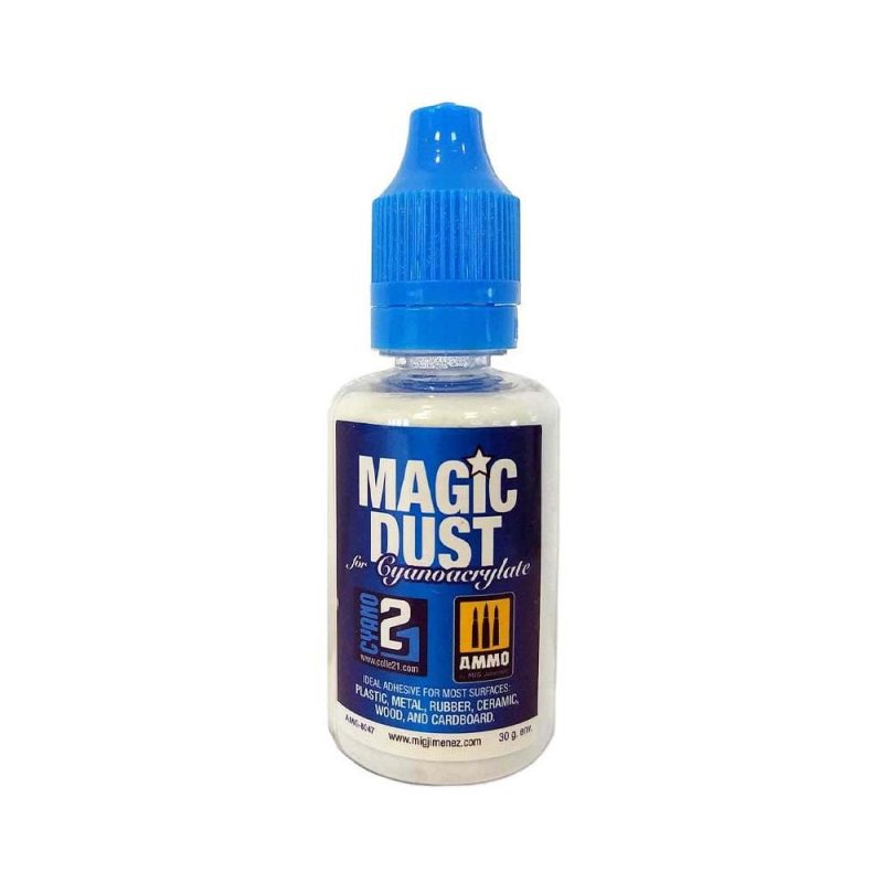 A.MIG-8047 MAGIC DUSTWith this powder you can strengthen and reinforce cyanoacrylate joints. It can also be used as a putty to fill gaps. This versatile product is easy to use and features a dispenser for precise application. Simply apply the product over the cyanoacrylate to speed up the cure time. The application process can be reversed: apply Magicdust 21 first and then the CA glue, leave the product to cure for approximately 5 minutes. Any excess can then be sanded away, the solid surface can also be engraved. If necessary, the application process can be repeated until the desired result is obtained.