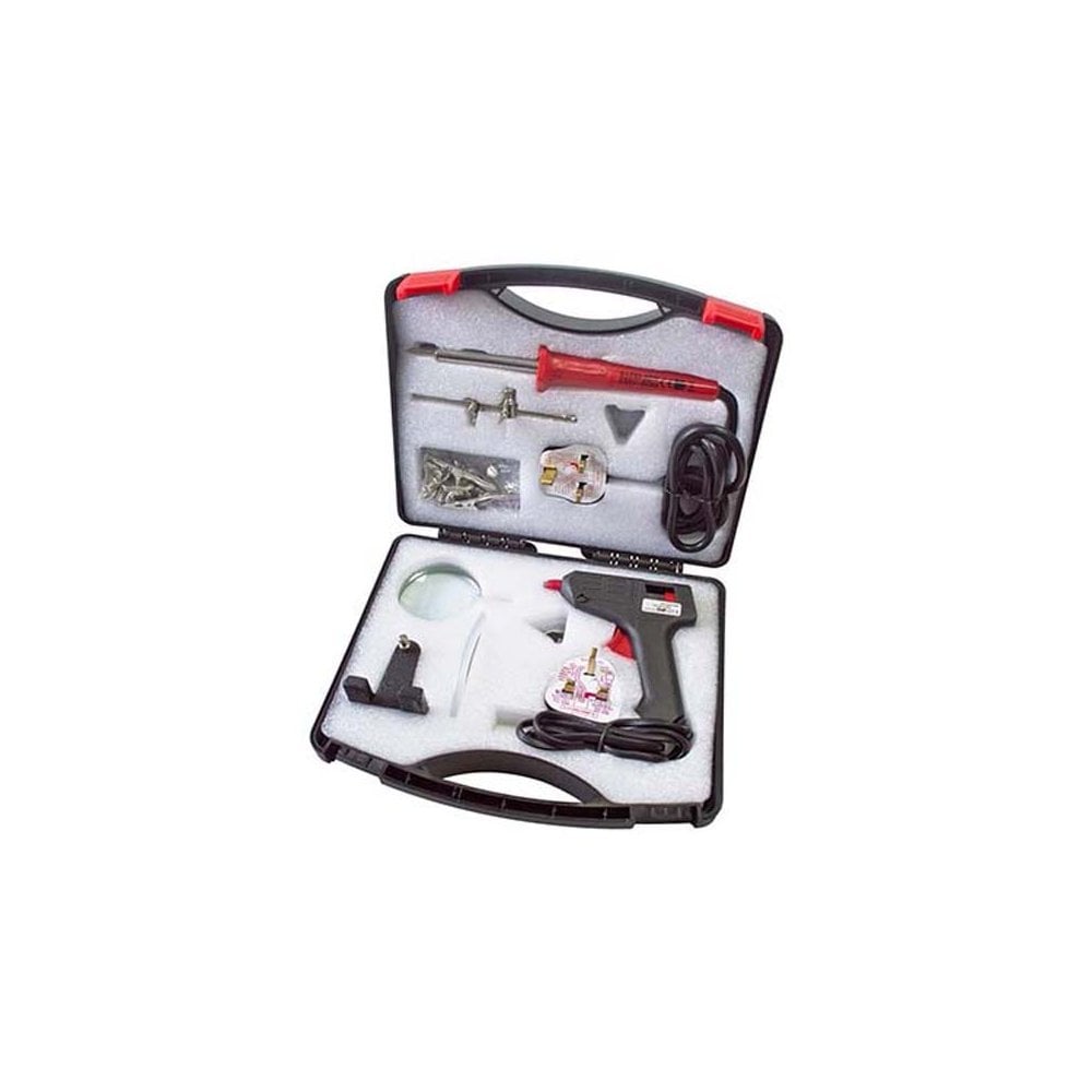 Set includes 30W soldering iron, 10W glue gun with two glue sticks and helping hand magnifier30W soldering iron: fitted with 3 pin BS plug, long reach tip heats to high temperature, insulated plastic handle10W glue gun: pistol grip with trigger control, supplied with 2 glue sticks and wire stand, fitted with 3 pin BS plugHelping hand magnifier: approx 60mm diameter magnifying lens, moveable arms and crocodile holding clipsSupplied in storage case