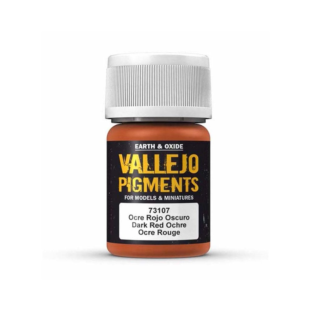 35ml Dark Red Ocre Pigment Vallejo 73.107 The Vallejo Pigments, a selection of natural earth and synthetic pigments, have been chosen for their permanence, their excellent light fastness, and for the extra fine milling of their particles, which facilitates the mixtures and their application on models and dioramas. The range of pigments includes a series of colors selected for representing the wear and erosion caused by the conditions of hard use and exposure on vehicles and buildings, to reproduce the dust caked on the tracks of the tanks, the rust on the armour and the wide range of effects caused by the climate and geographic conditions of deployment. Pigments can be applied in their dry form, directly by brush on the model, since they have excellent adherence; they can also be fixed in place with Thinner when used to portray dry mud or accumulated dust. With Pigment Binder, the pigments can be used to create volumes, such as accumulated dirt and mud. Painting tools are cleaned with water.