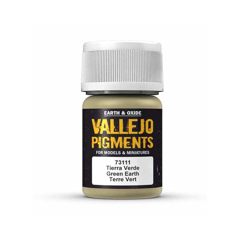 35ml Green Earth Pigment Vallejo 73.111 The Vallejo Pigments, a selection of natural earth and synthetic pigments, have been chosen for their permanence, their excellent light fastness, and for the extra fine milling of their particles, which facilitates the mixtures and their application on models and dioramas. The range of pigments includes a series of colors selected for representing the wear and erosion caused by the conditions of hard use and exposure on vehicles and buildings, to reproduce the dust caked on the tracks of the tanks, the rust on the armour and the wide range of effects caused by the climate and geographic conditions of deployment. Pigments can be applied in their dry form, directly by brush on the model, since they have excellent adherence; they can also be fixed in place with Thinner when used to portray dry mud or accumulated dust. With Pigment Binder, the pigments can be used to create volumes, such as accumulated dirt and mud. Painting tools are cleaned with water.