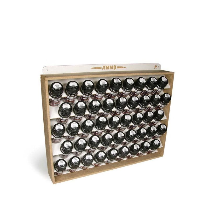 Shelves optimized to store 45 cans of 35 mL in the smallest possible space.The bottles are stored at an angle minimizing its size and allows us to find our colors at a glance. Size 40 x 30 x 6.5 cm. It can be placed on a table or hung on the wall. Easy to assemble in minutes. Requires white glue not included. 35ml jars not included