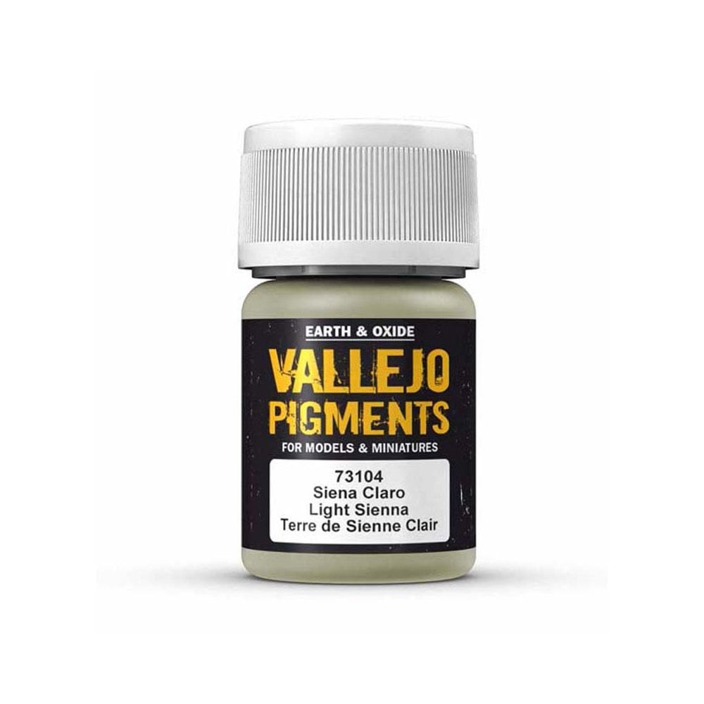 35ml Light Sienna Pigment Vallejo 73.104 The Vallejo Pigments, a selection of natural earth and synthetic pigments, have been chosen for their permanence, their excellent light fastness, and for the extra fine milling of their particles, which facilitates the mixtures and their application on models and dioramas. The range of pigments includes a series of colors selected for representing the wear and erosion caused by the conditions of hard use and exposure on vehicles and buildings, to reproduce the dust caked on the tracks of the tanks, the rust on the armour and the wide range of effects caused by the climate and geographic conditions of deployment. Pigments can be applied in their dry form, directly by brush on the model, since they have excellent adherence; they can also be fixed in place with Thinner when used to portray dry mud or accumulated dust. With Pigment Binder, the pigments can be used to create volumes, such as accumulated dirt and mud. Painting tools are cleaned with water.