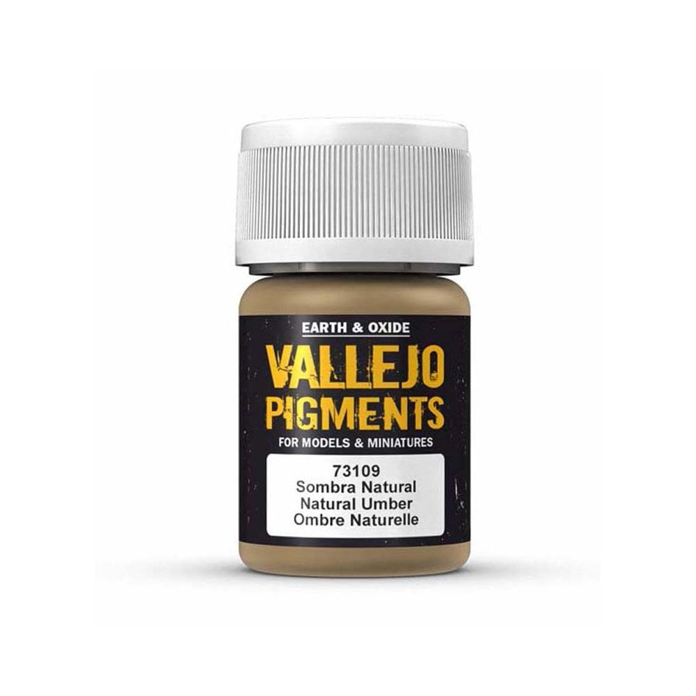 35ml Natural Umber Pigment Vallejo 73.109 The Vallejo Pigments, a selection of natural earth and synthetic pigments, have been chosen for their permanence, their excellent light fastness, and for the extra fine milling of their particles, which facilitates the mixtures and their application on models and dioramas. The range of pigments includes a series of colors selected for representing the wear and erosion caused by the conditions of hard use and exposure on vehicles and buildings, to reproduce the dust caked on the tracks of the tanks, the rust on the armour and the wide range of effects caused by the climate and geographic conditions of deployment. Pigments can be applied in their dry form, directly by brush on the model, since they have excellent adherence; they can also be fixed in place with Thinner when used to portray dry mud or accumulated dust. With Pigment Binder, the pigments can be used to create volumes, such as accumulated dirt and mud. Painting tools are cleaned with water.