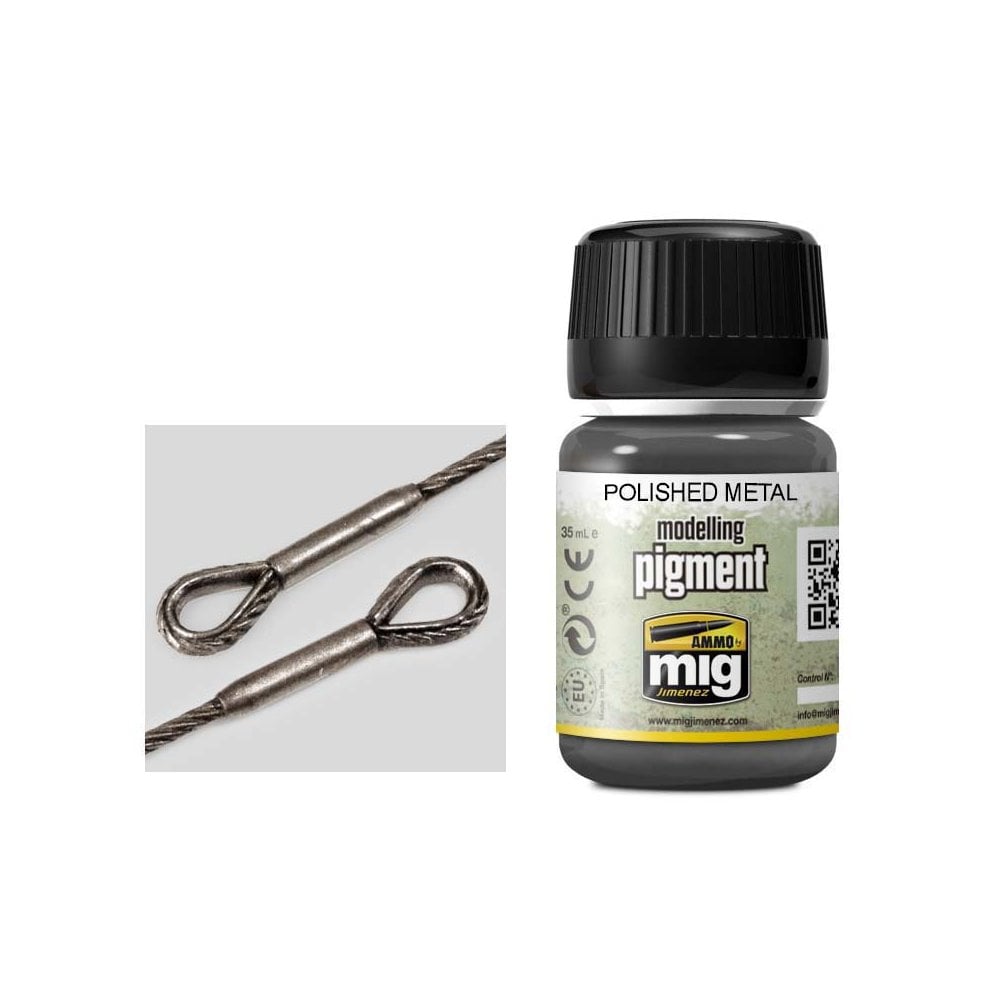 35ml Polished Metal Pigment A.MIG-3021 Ammo Mig JimenezHigh quality pigment, superfine and made with natural products for exclusive use in modelling. This unique colour is specially designed to achieve effects in your models using the techniques that Mig Jimenez created more than a decade ago. With this tone you will obtain a polished hyper-realistic metal finish by simply rubbing the pigment on a previously painted surface. Ideally suited to be combined with Gun Metal pigment A.MIG-3009 for beautiful and accurate weapons, tow cables, and exposed metal.
