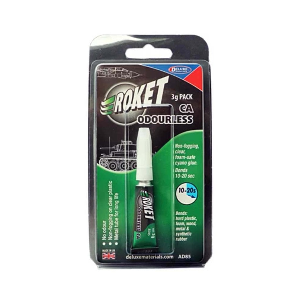 Deluxe Materials Roket Odourless CA is a clear, non-fogging cyanoacrylate adhesive formulated to bond painted or clear plastics without leaving marks or haze. Its odourless composition makes it suitable for use in enclosed spaces or by those sensitive to traditional CA fumes. This adhesive is also foam-safe, providing a versatile solution for a range of hobby and modelling applications.