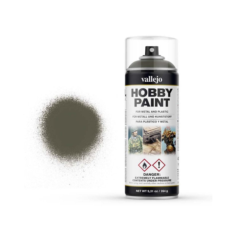400ml AFV Russian Green 4BO Vallejo 28.003 : The perfect combination of base coat and highly pigmented color, developed for use on all metal, plastic and resin models and miniatures. Our new original and unique spray formula leaves a perfect matt and self-levelling finish, designed to respect and bring forth even the finest details of the models and miniatures.The Hobby Paint assortment includes 3 basic colors, 19 fantasy shades, 5 WWII AFV and 4 WWII infantry colors.The colors are a perfect match to the equivalent shades available in our Game and Model Color ranges, so both painting techniques can be combined. Each Hobby Paint shows the original color applied on the colored ring around the top and is equipped with 2 different nozzles; one with a low discharge flow, especially recommended for fine lines and small details, and the other with a medium discharge flow, recommended for thicker lines and for covering larger surfaces; the low-pressure valve allows for excellent spray control.The range is complemented with 3 different varnishes: gloss, matt and satin, recommended for providing extra protection when handling your figures and to give them an overall uniform appearance. Aerosols can not be sent by Royal Mail and must be sent with DPD