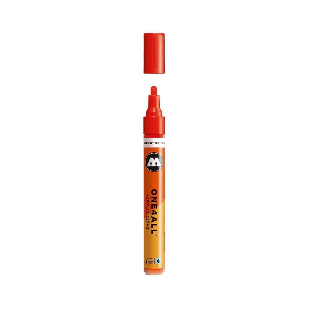 4mm 013 Traffic Red Molotow 227202Highly opaque and UV resistant on nearly all surfaces: The sustainable ONE4ALL™ acrylic marker system has been built to refill and is always reliable in all its functions. A low wear and numerous possible applications offer an added value to these markers. Whether painting surf board, canvas, fridge, graffiti or sneakers: nothing is impossible. With 50 color shades, these markers are talented all-rounders. Individual nuances and color shades can be mixed easily. Effect colors make coloring exciting. Shouldn’t be missing in an artists product range – everyone’s darling since 2008.