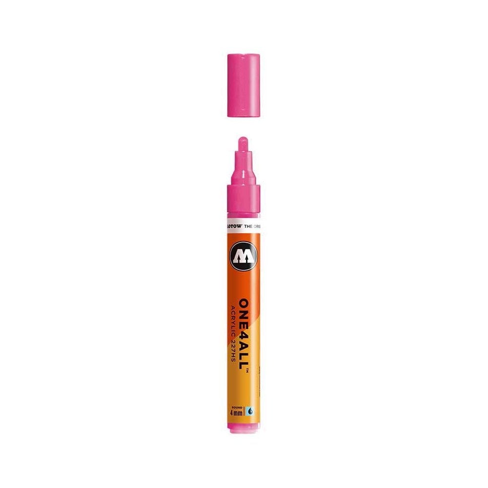 4mm 200 Neon Pink Molotow 227208Highly opaque and UV resistant on nearly all surfaces: The sustainable ONE4ALL™ acrylic marker system has been built to refill and is always reliable in all its functions. A low wear and numerous possible applications offer an added value to these markers. Whether painting surf board, canvas, fridge, graffiti or sneakers: nothing is impossible. With 50 color shades, these markers are talented all-rounders. Individual nuances and color shades can be mixed easily. Effect colors make coloring exciting. Shouldn’t be missing in an artists product range – everyone’s darling since 2008.