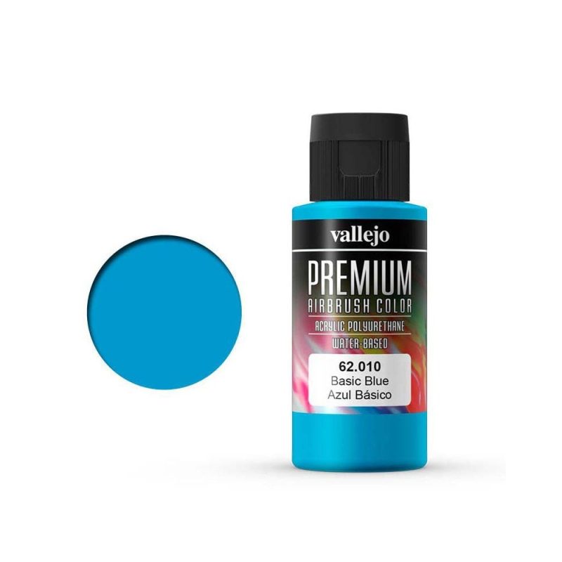 60ml Basic Blue Vallejo Premium Airbrush Color 62.010 AV PREMIUM is a safe water-based, non toxic and highly versatile airbrush ready paint, suitable for all surfaces, but especially formulated for superior adhesion to metals, fibreglass, polyethylene, clear Lexanª polycarbonate, slot car and RC bodies, and all tuning and automotive applications.Premium colors have been formulated with micronized, permanent pigments and an extremely resistant, exterior grade hybrid resin-polyurethane base, which withstands impacts, resists chipping and cracking, as well as direct exposure to heat and outdoor elements without cracking or fading, and is fuel residue proof up to a least 35% Nitro.