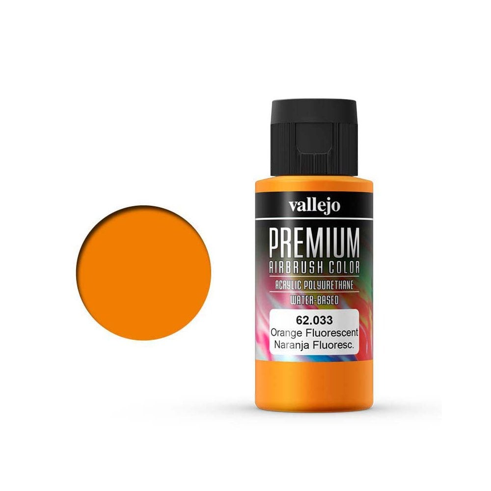 60ml Orange Fluorescent Vallejo Premium Airbrush Color 62.033 AV PREMIUM is a safe water-based, non toxic and highly versatile airbrush ready paint, suitable for all surfaces, but especially formulated for superior adhesion to metals, fibreglass, polyethylene, clear Lexanª polycarbonate, slot car and RC bodies, and all tuning and automotive applications.Premium colors have been formulated with micronized, permanent pigments and an extremely resistant, exterior grade hybrid resin-polyurethane base, which withstands impacts, resists chipping and cracking, as well as direct exposure to heat and outdoor elements without cracking or fading, and is fuel residue proof up to a least 35% Nitro.