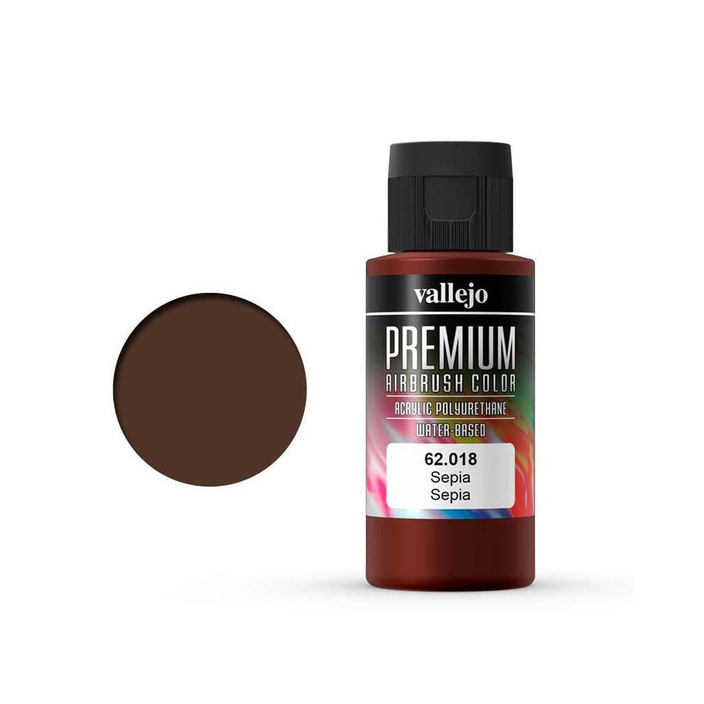 60ml Sepia Vallejo Premium Airbrush Color 62.018 AV PREMIUM is a safe water-based, non toxic and highly versatile airbrush ready paint, suitable for all surfaces, but especially formulated for superior adhesion to metals, fibreglass, polyethylene, clear Lexanª polycarbonate, slot car and RC bodies, and all tuning and automotive applications.Premium colors have been formulated with micronized, permanent pigments and an extremely resistant, exterior grade hybrid resin-polyurethane base, which withstands impacts, resists chipping and cracking, as well as direct exposure to heat and outdoor elements without cracking or fading, and is fuel residue proof up to a least 35% Nitro.