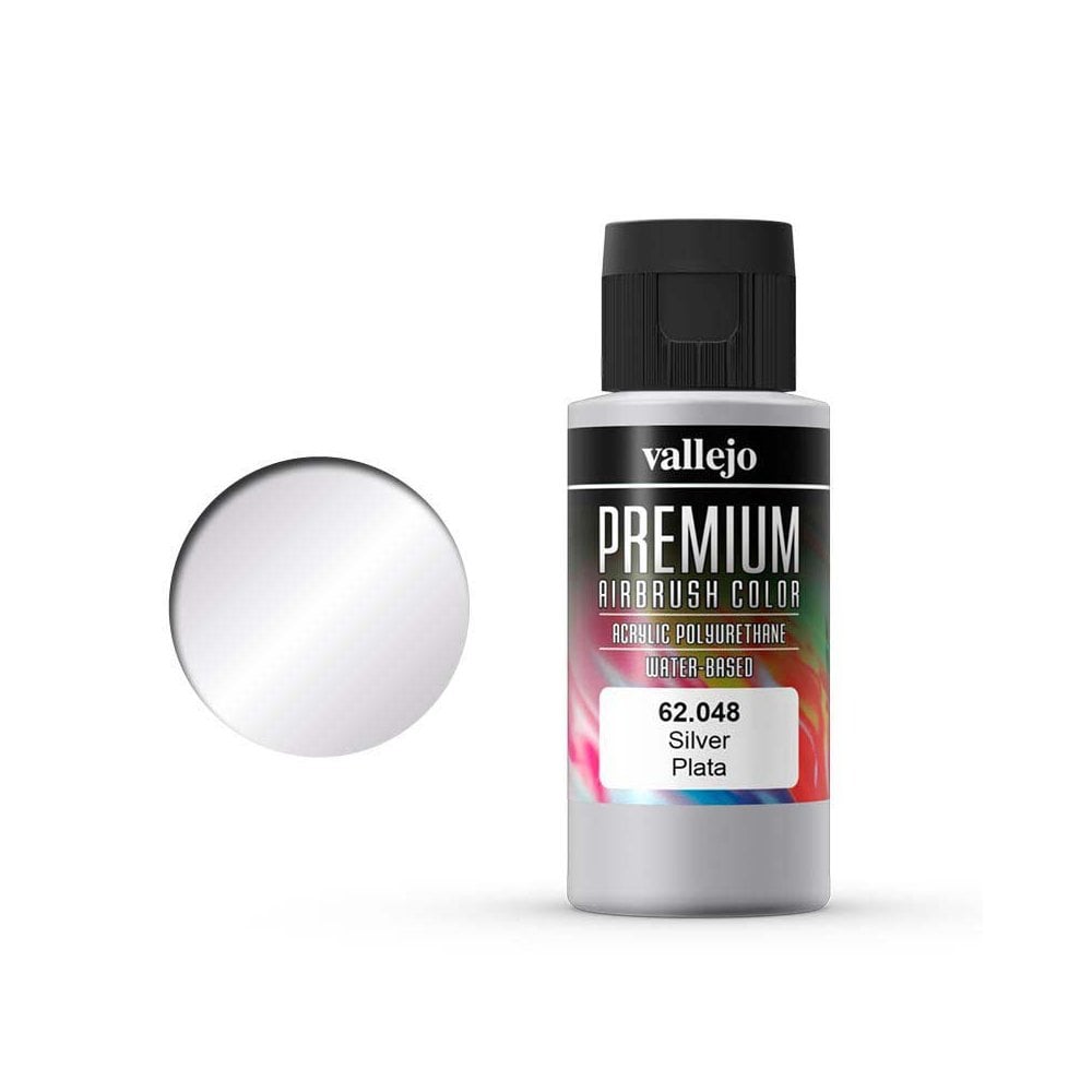 60ml Silver Vallejo Premium Airbrush Color 62.048 AV PREMIUM is a safe water-based, non toxic and highly versatile airbrush ready paint, suitable for all surfaces, but especially formulated for superior adhesion to metals, fibreglass, polyethylene, clear Lexanª polycarbonate, slot car and RC bodies, and all tuning and automotive applications.Premium colors have been formulated with micronized, permanent pigments and an extremely resistant, exterior grade hybrid resin-polyurethane base, which withstands impacts, resists chipping and cracking, as well as direct exposure to heat and outdoor elements without cracking or fading, and is fuel residue proof up to a least 35% Nitro.