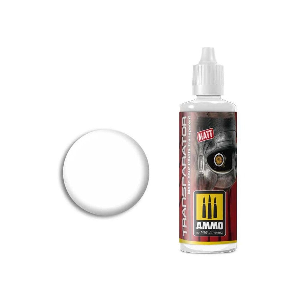 Water based thinner available in 17mL and 60mL formatsWater based thinner specifically designed for use with AMMO acrylics, also compatible with other acrylic brands as well. This product is necessary for painting semi-transparent acrylic coats with brush or airbrush easily without changing the quality and finish of paint while adding a completely matt finish. Transparator Matt is water soluble, odourless, and non-toxic. Shake well before each use. This bottle includes a stainless-steel agitator to facilitate mixture. Dries completely in 24 hours.Watch our new video about TRANSPARATOR by following this link: