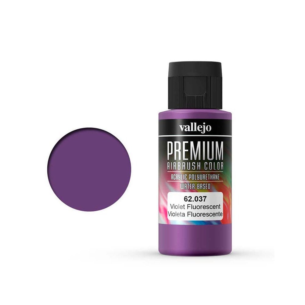 60ml Violet Fluorescent Vallejo Premium Airbrush Color 62.037 AV PREMIUM is a safe water-based, non toxic and highly versatile airbrush ready paint, suitable for all surfaces, but especially formulated for superior adhesion to metals, fibreglass, polyethylene, clear Lexanª polycarbonate, slot car and RC bodies, and all tuning and automotive applications.Premium colors have been formulated with micronized, permanent pigments and an extremely resistant, exterior grade hybrid resin-polyurethane base, which withstands impacts, resists chipping and cracking, as well as direct exposure to heat and outdoor elements without cracking or fading, and is fuel residue proof up to a least 35% Nitro.