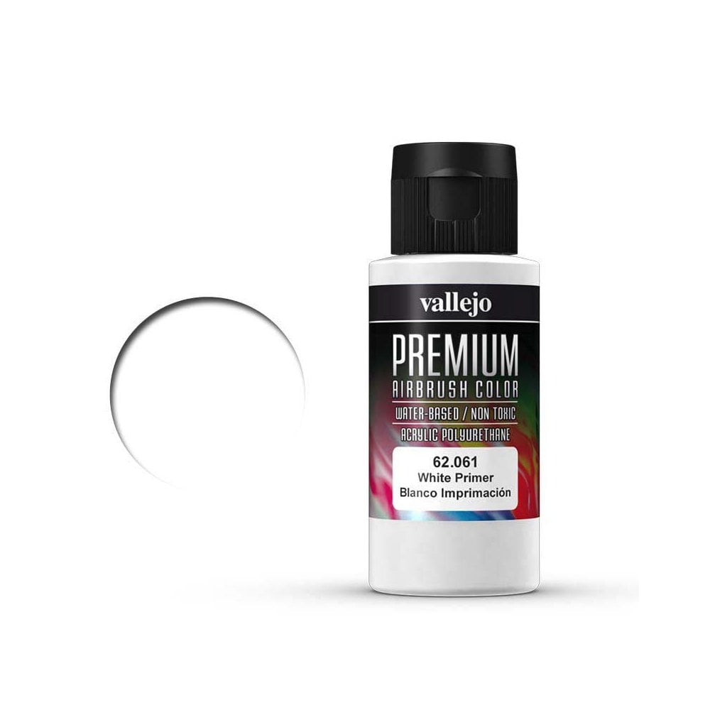 60ml White Primer Vallejo Premium Airbrush Color 62.061AV PREMIUM is a safe water-based, non toxic and highly versatile airbrush ready paint, suitable for all surfaces, but especially formulated for superior adhesion to metals, fibreglass, polyethylene, clear Lexanª polycarbonate, slot car and RC bodies, and all tuning and automotive applications.Premium colors have been formulated with micronized, permanent pigments and an extremely resistant, exterior grade hybrid resin-polyurethane base, which withstands impacts, resists chipping and cracking, as well as direct exposure to heat and outdoor elements without cracking or fading, and is fuel residue proof up to a least 35% Nitro.
