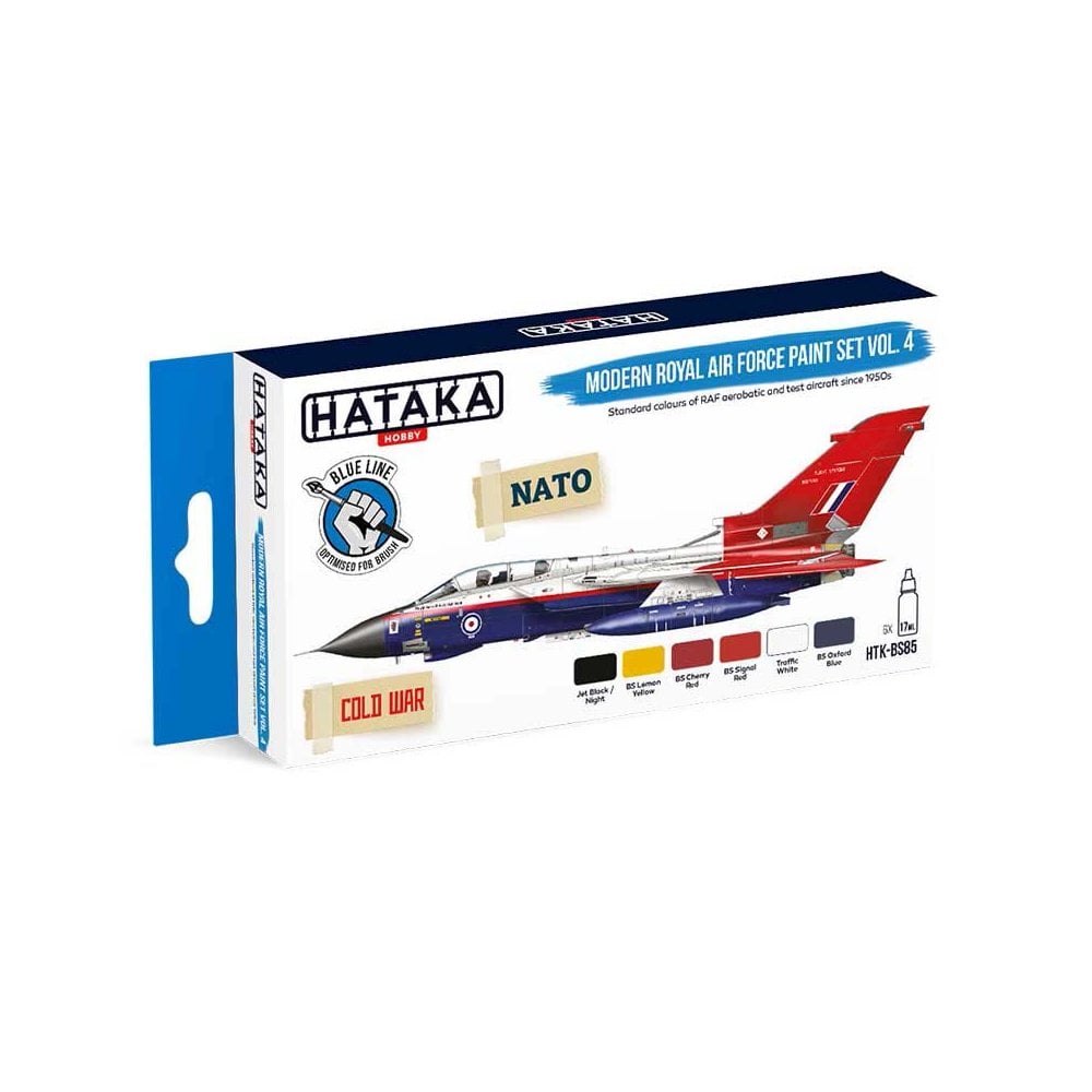 Modern RAF Vol.4 Set (Blue Line Acrylic) Hataka BS85DESCRIPTIONBLUE LINE OPTIMISED FOR BRUSHStandard colours of RAF aerobatic and test aircraft since 1950sThe Royal Air Force is world-famous not only due to its combat achievements, but also thanks to supreme quality of its aerobatic / display teams. Since 1950s the most important teams included: The Black Arrows (formed in 1956, the RAFs premier team until 1961, flying Hawker Hunter), The Yellowjacks (formed in RAF Valley in 1963, existed till 1965, flying Folland Gnat) and the famous Red Arrows (officially known as the Royal Air Force Aerobatic Team, formed in late 1964 at RAF Fairford, part of the Central Flying School, flying Folland Gnat till 1979, since then BAe Hawk T1). Apart from the colours used by the above mentioned teams, this paint set also covers the unique Raspberry Ripple livery of British test aircraft flown by ETPS, A&AEE and RAE.Contains the following colours (acrylic paints, water-based, optimised for use with brush):HTK-B100 Jet Black / Night Exact match with BS381C:642, overall colour of Hunters of RAF Black Arrows aerobatic team (No. 111 Squadron RAF)HTK-B290 BS Lemon Yellow BS381C:355, overall colour of Folland Gnats of RAF Yellowjacks aerobatic team, part of No 4 Flying Training SchoolHTK-B291 BS Cherry Red BS381C:538, also called Post Office Red or Roundel Red. Overall colour of Folland Gnats of Red Arrows (until 1979)HTK-B276 BS Signal Red BS381C:537, current Red Arrows colour. Also used for fuselage stripes, tail and wingtips in Raspberry Ripple liveryHTK-B101 Traffic White Used for upper body and wings in so-called Raspberry Ripple livery of British test aircraft of ETPS, A&AEE and RAEHTK-B292 BS Oxford Blue BS381C:105, used for lower fuselage in Raspberry Ripple painting of British test aircraft of ETPS, A&AEE and RAE