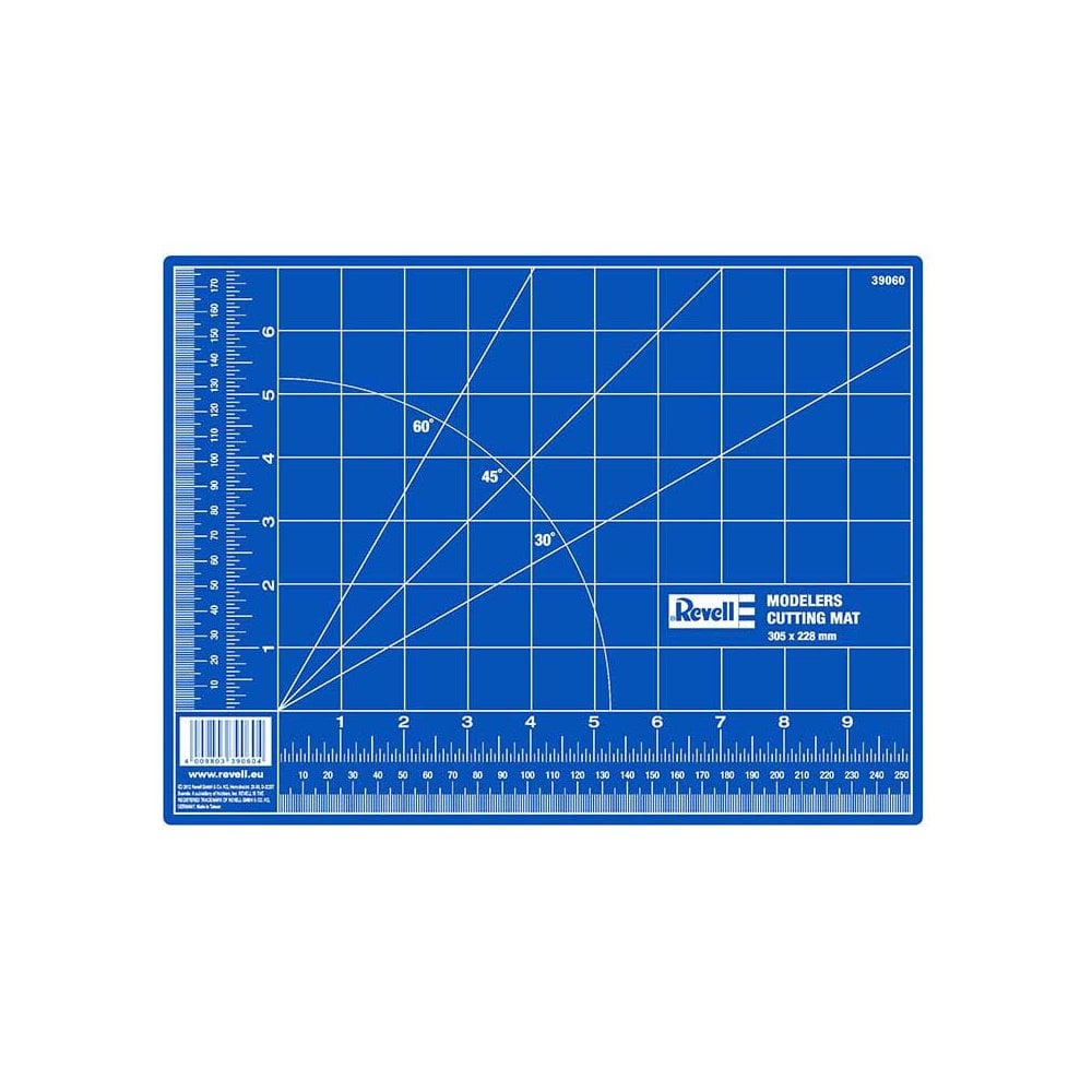 A cutting mat is an indispensable hobby tool. It protects building surfaces and its self-sealing design also prolongs blade sharpness! In addition, there is a useful printed grid for checking part alignment during construction, both Imperial and Metric measuring marks, plus 30, 45 and 60 degree angle guides. Measures: 305 x 228mm.