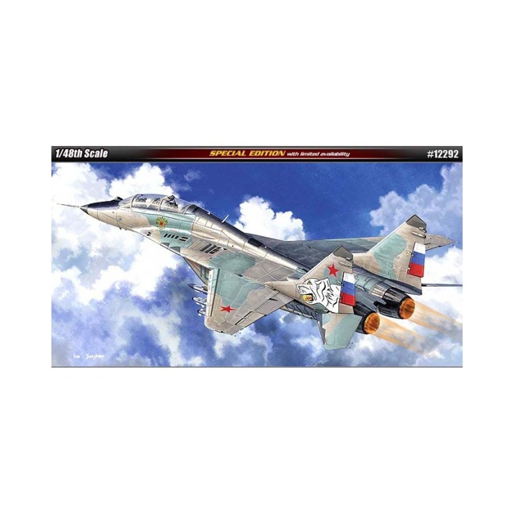 The Academy 12292 kit depicts the Mikoyan MiG-29UB, a twin-seat variant of the famous Russian multirole fighter. Produced in 1/48 scale, this limited edition kit features detailed cockpit interiors, external stores, and premium decals representing Russian Air Force service. It offers modellers a finely engineered replica of one of the Cold War’s most enduring jet designs.