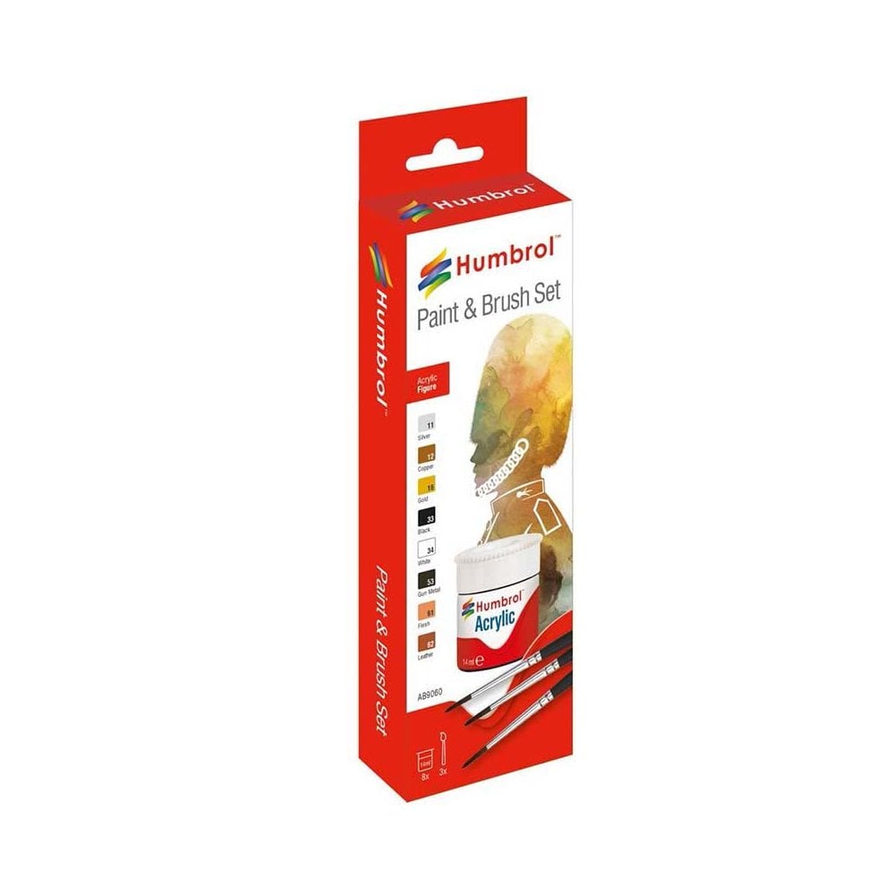 Acrylic Figure Painting Set Humbrol AB9060The Paint & Brush Sets here are for those wanting a good concise selection of paints and brushes in one easy purchase. These sets are particularly helpful for anyone using these excellent paints for non-plastic modelling hobbies and tasks.Contents• 3 Brushes• 11 Silver• 12 Copper• 16 Gold• 33 Black• 34 White• 53 Gun Metal• 61 Flesh• 62 Leather