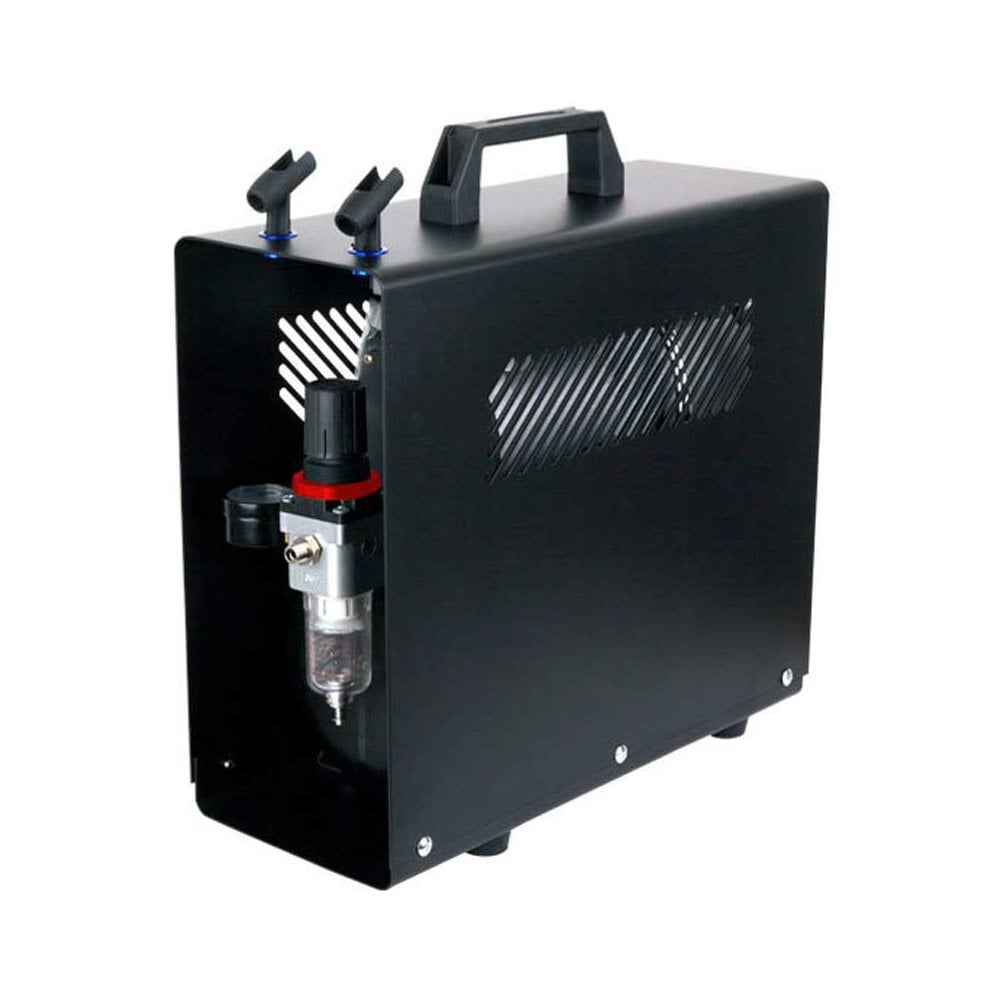 Specifications Portable & lightweight. Thermally protected. Low noise. Auto stop. Pressure-adjustable. With the additional fan to cool down the air compressor to ensure the air compressor working temperature on the 70 celsius degree(After long time working). This oil-free piston compressor(Airbrush Compressor) is an excellent alternative to purchasing propellant cans for your airbrush. The AS-186 has a 3L tank that has its pressure maintained automatically by the compressor. Once it has reached the maximum output pressure of 57 PSI it shuts off automatically. Only auto restart when the airbrush is triggered and the tank pressure falls below 50 PSI. Compact, portable and quiet, it provides an oil free air supply that is ideal for designers, modellers, artists, cake decorators, nail art and spray tanning. Ultra quiet – can be used unobtrusively in the home Maintenance free oil-less piston design with lightweight aluminium construction Built in carry handle – light and easy to transport 3.0 litre Receiver tank – ensures pulse free output, and use of up to two airbrushes simultaneously (adaptor required) Industrial type Pressure regulator with gauge, water trap and air filter Pressure relief safety valve Rubber feet Motor: 220-240V 50Hz Rotational speed: 1450 rpm/ 1700 rpm Auto-Stop at 4Bar; Auto Re-Start at 3bar Maximum pressure: 57 psi (4 BAR) 1/8 BSP Male outlet Air Delivery: 23 litres/min