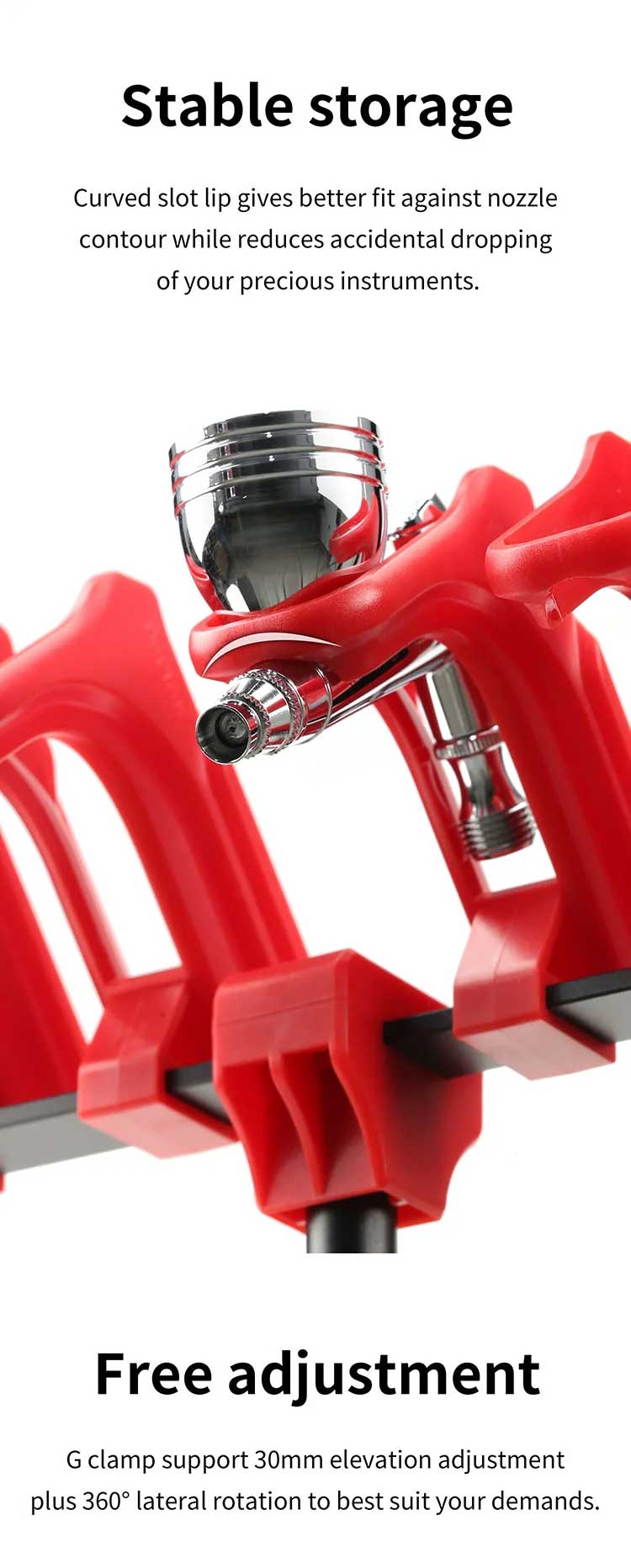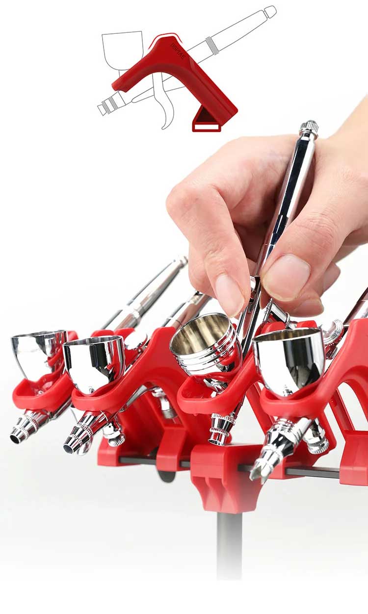 - Stable Storage: Curved slot lips provide a better fit against nozzle contours, reducing the risk of accidental dropping of your airbrushes.