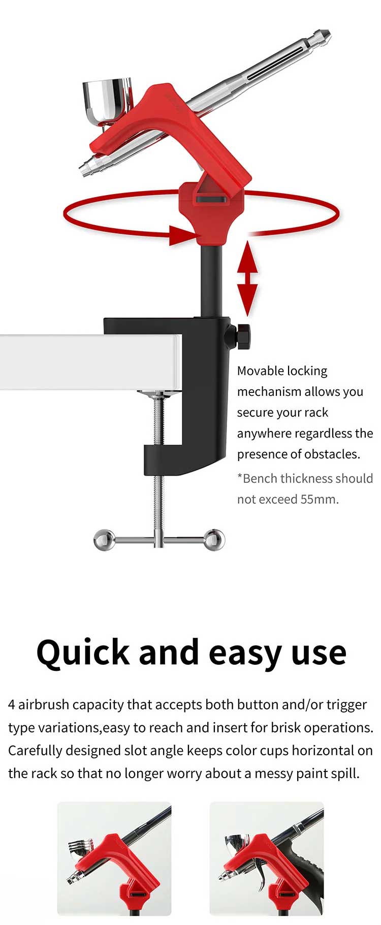 - Quick and Easy Use: Designed to hold up to four airbrushes, accommodating both button and trigger types. The carefully designed slot angle keeps color cups horizontal, preventing messy paint spills.
