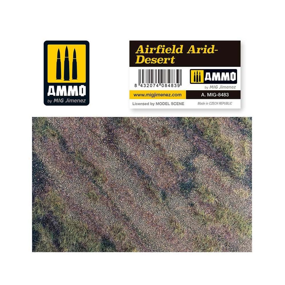 Airfield Arid Desert (245 mm x 245 mm) Ammo A.MIG-8483Scenic mat ideal for recreating earthen and grass airfields such as those used in World War I and WWII in a realistic way. Airfield Spring is also perfect for representing unpaved roads in your small scenes and dioramas with vehicles and figures.The size makes this product optimum for scales 1:48, 1:35, and 1:32.