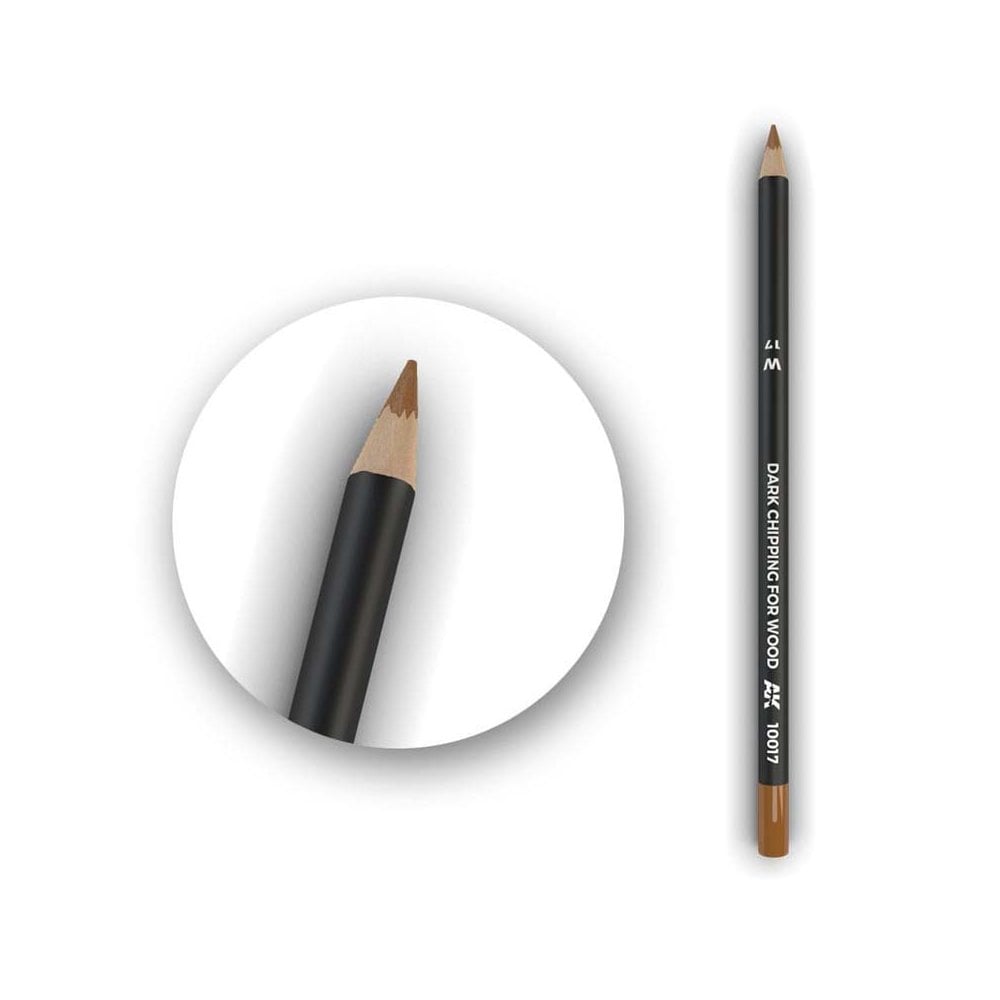 The AK Interactive Dark Chipping For Wood Weathering Pencil is a precision tool designed for creating natural wear and chipped paint effects on wooden surfaces. With its semi-grease 17cm core, it provides smooth application and easy blending to add realism to model details.