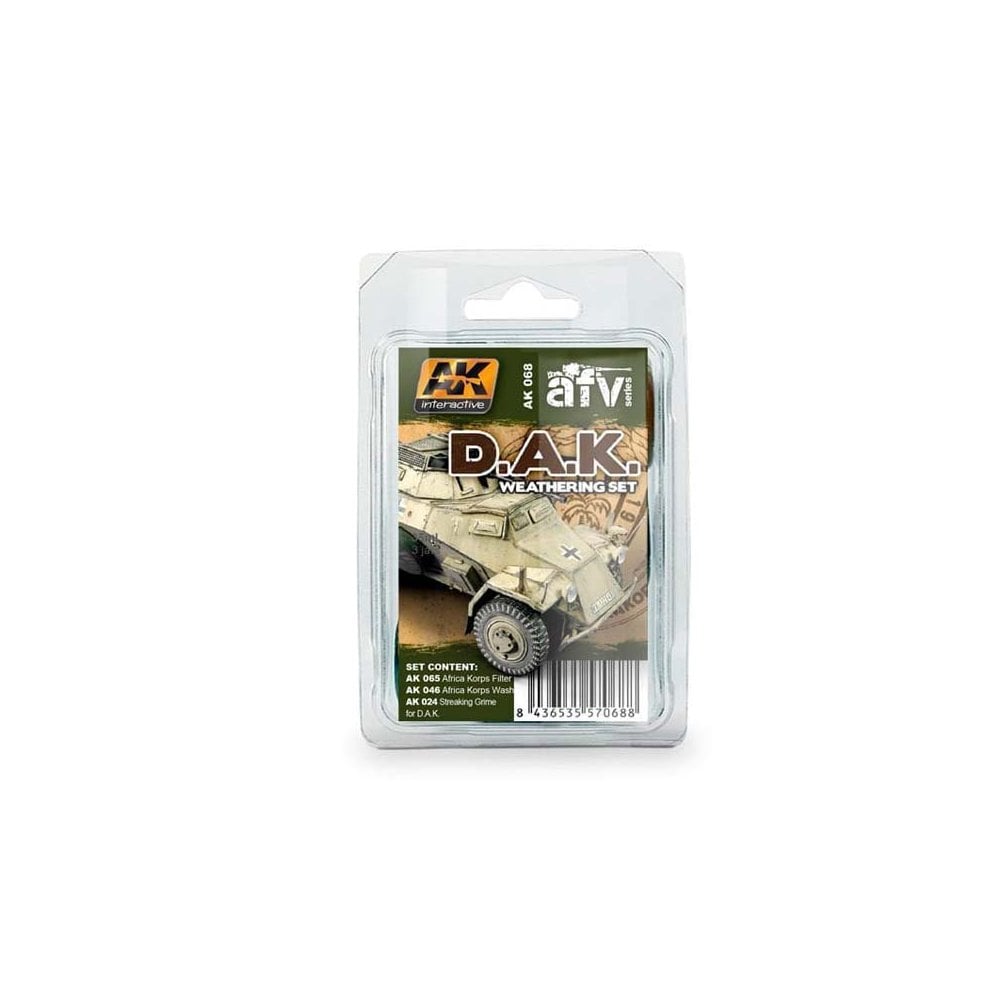 The AK Interactive Africa Korps Weathering Set is designed to replicate the unique weathering effects seen on German vehicles in North Africa. Containing a filter, a wash, and a streaking grime product, this set provides everything required to achieve dusty, sun-faded, and desert-worn finishes typical of DAK vehicles.