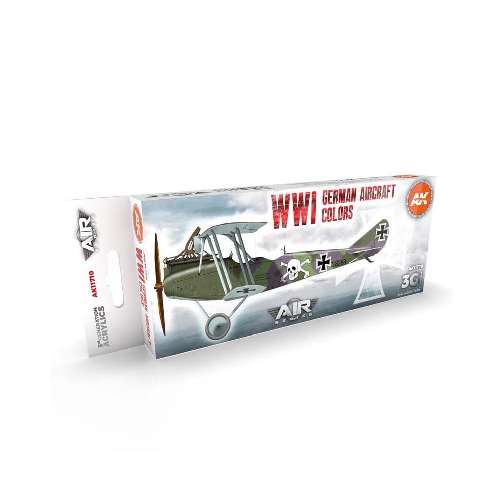 This set offers the modeller, the seven colors that are essential for replicating the camouflage patterns that were most commonly seen on German aircraft, operated during World War One. Also included is the Grey- Green Primer color that was typically used for painting all metal panels and fittings. A profile guide is printed on the backside of the box. Our paints are not only historically accurate and specially formulated with top quality components; they also have been designed taking into account the scale reduction effect.*Our acrylic paints are ready to use straight from the bottle; simply shake, and the paint is ready to go. Dilution is not necessary when airbrushing AK acrylic paints; however, when painting camouflage or fine lines, add a few drops of our specially formulated thinner AK11500. Useful for all acrylic paints, the AK11500 improves the performance of the paint and is vastly superior to most other available thinners, resulting in a greater degree of coverage when applied by brush. This set contains:AK11801 WWI German Fokker GreyAK11802 WWI German Light GreenAK11803 WWI German Dark GreenAK11804 WWI German MauveAK11805 WWI German Red BrownAK11806 WWI German Light BlueAK11807 WWI German LilacAK11808 WWI German Grey-Green Primer *A model aircraft reflects less light than an actual full size aircraft; this means the color applied to the model must be of a lighter shade to look the same as the full sized version. If the same color tones were applied to each, the model would appear darker as it reflects less light.