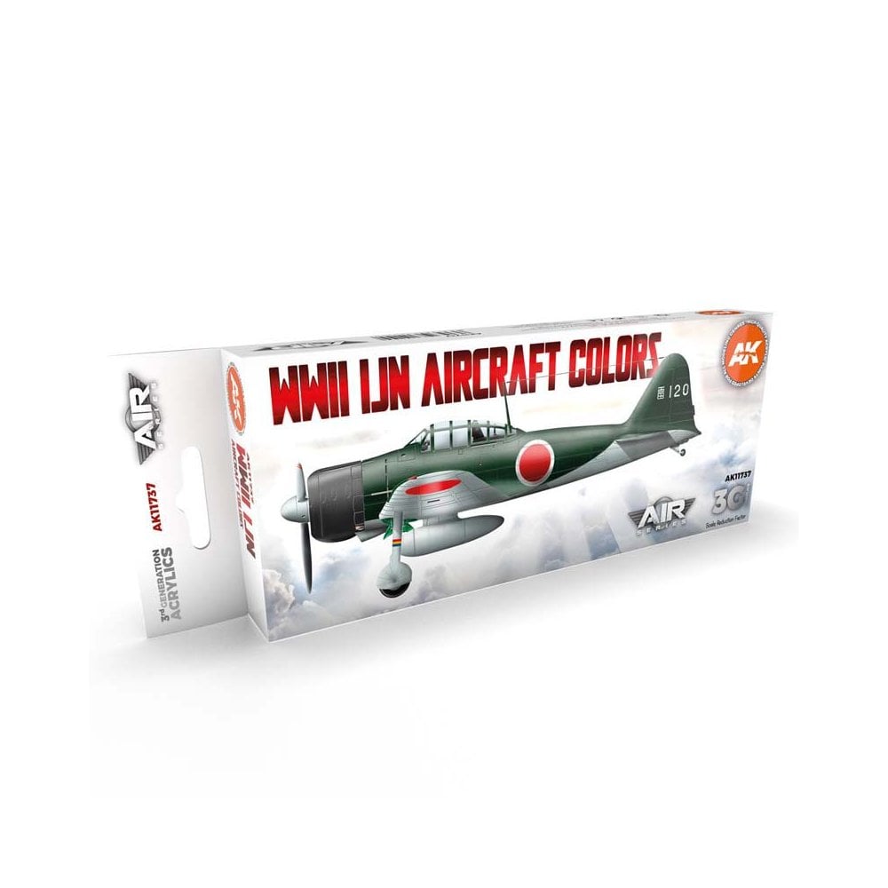 This set contains:AK11891 IJN J3 Hai-iro (Grey)AK11892 IJN J3 SP (Amber Grey)AK11893 IJN D1 Deep Green BlackAK11894 IJN D2 Green BlackAK11895 IJN Q1 Anti-Glare Blue-BlackAK11896 IJN M3 (M) Mitsubishi Interior GreenAK11897 IJN M3 (N) Nakajima Interior GreenAK11898 IJN/IJA Aotake *A model aircraft reflects less light than an actual full size aircraft; this means the color applied to the model must be of a lighter shade to look the same as the full sized version. If the same color tones were applied to each, the model would appear darker as it reflects less light.
